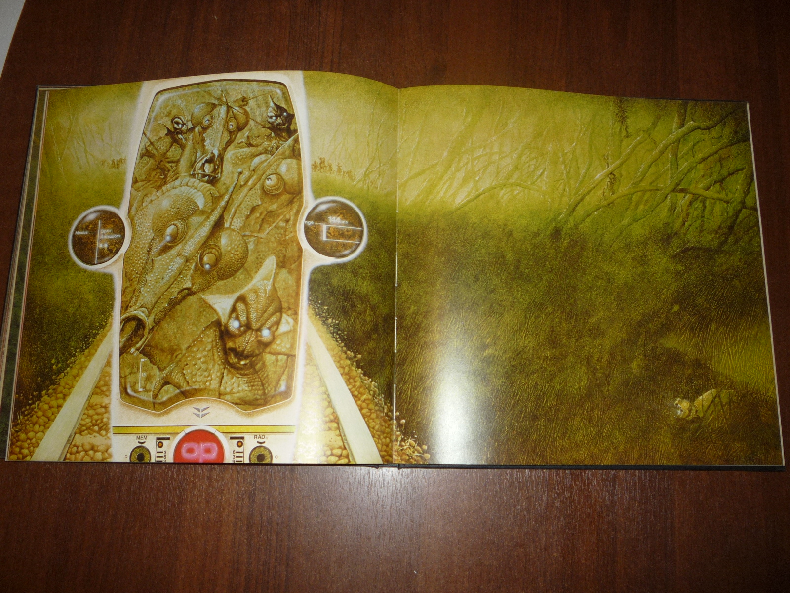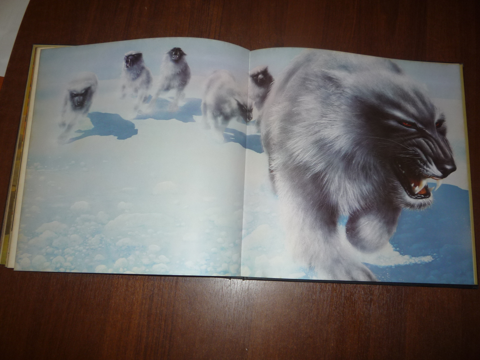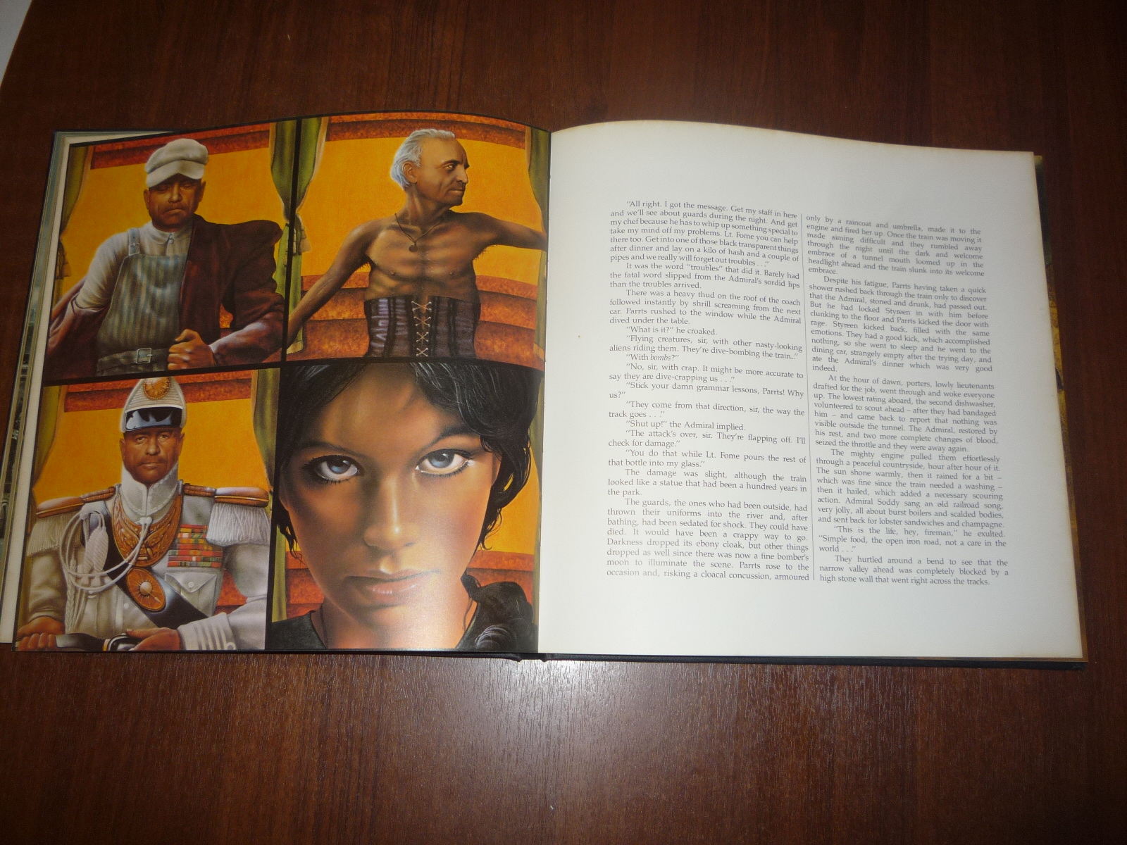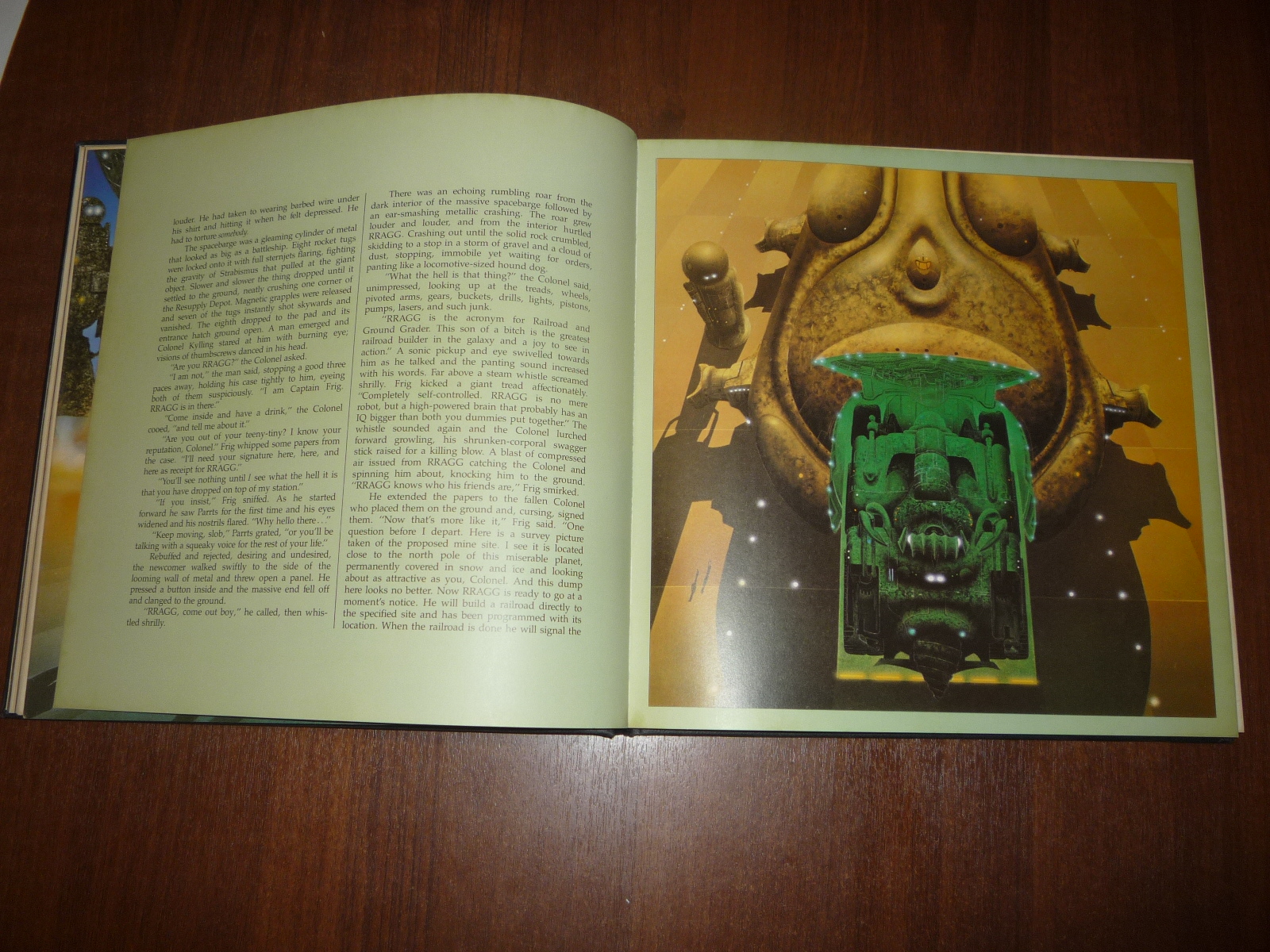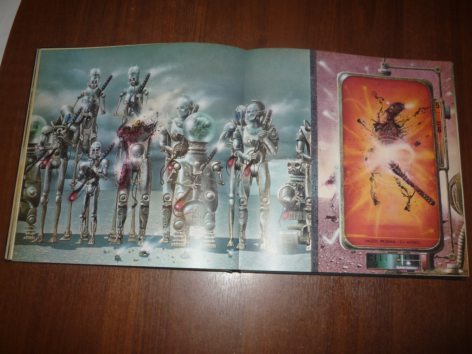 Тем не менее, заинтересовавшись изданием, в тот же день рискнул приобрести у английских букинистов английский же выпуск (книга была напечатана в мягкой обложке и твердой, по цене они сейчас практически сравнялись, 5-10 фунтов), и сегодня его уже получил по почте. Издание кстати не тоненькое — плотная меловка, картонные крышки шитого переплета, все это весит под килограмм. Книга превзошла мои ожидания. Она закономерно помещается на полку к альбомам фантастической живописи — в ней очень много фантастических полноформатных цветных картин.