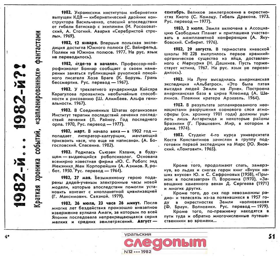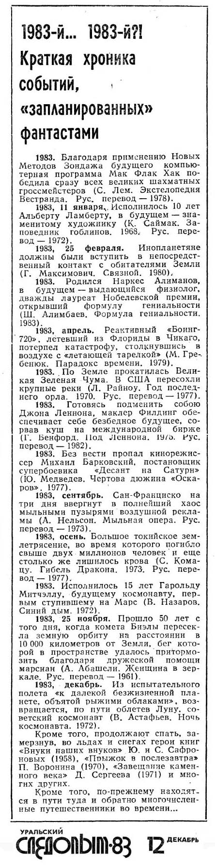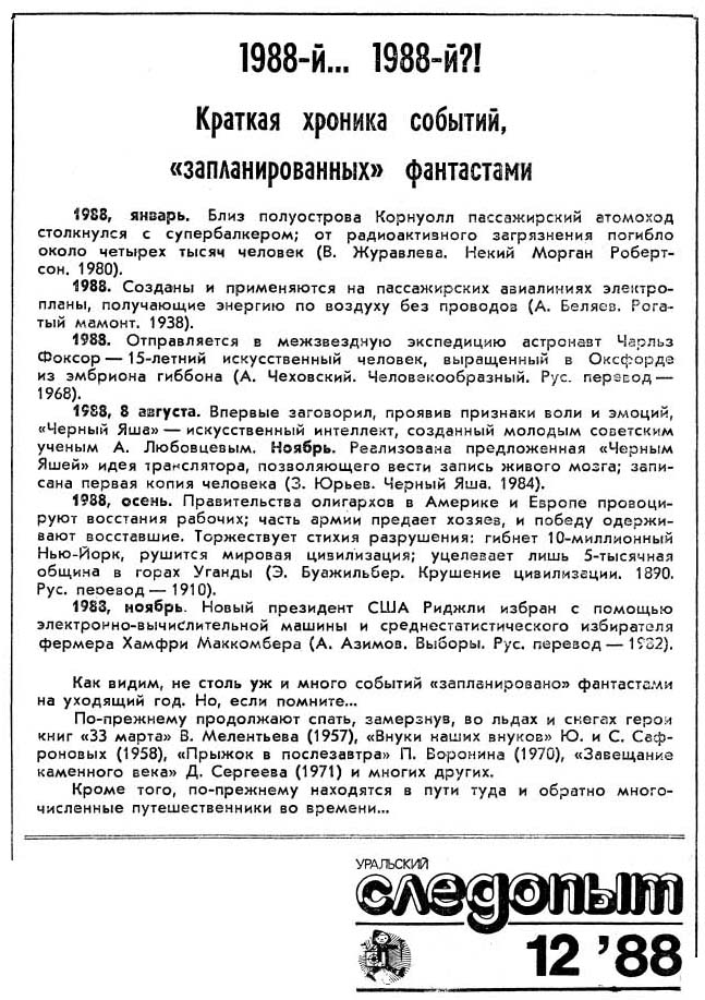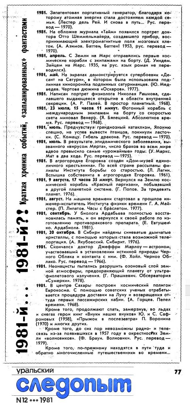 Читатели собирали примеры, присылали в редакцию, и в декабрьском выпуске журнала печатался сводный список событий из фантастических произведений.