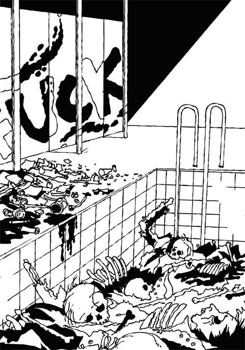 В желтом свете, отражающемся от жирных плиток, перед ними протянулся длинный могильник. Вода давным-давно высохла; дно бассейна было усыпано черепами, костями и обезображенными конечностями десятков тел. Перепутанные тела напоминали посетителей громадного пляжа, застигнутых внезапной катастрофой.