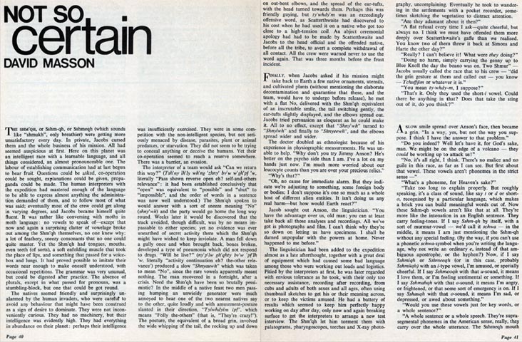 Иные истории значительно менее серьезны. К примеру, "Не уверен, что это так": диалогическая вещица о трудностях перевода с языка инопланетной расы, не только щедро сдобренная серьезными научными аргументами о фонетике, но и сулящая забавные открытия. При чтении таких рассказов, как "Доктор Фауста" и "Трансфинитный выбор", сталкиваясь с блистательными шутками, аллюзиями и неологизмами, легко вообразить себя в мире, вышедшем из-под машинки одного из современников Массона, Джона Слейдека.