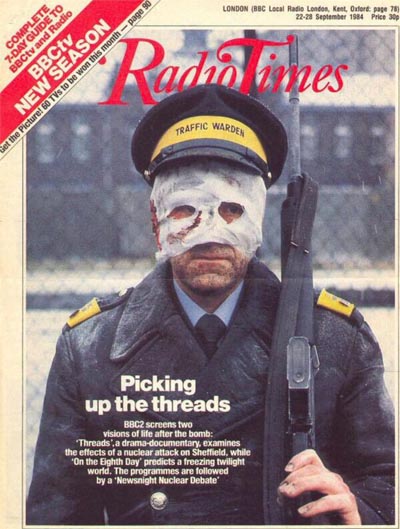 В Англии на канале ВВС показали фильм "Нити" (Threads, 1984, реж. Мик Джексон) — фильм тоже снят в жёсткой манере, без патетики и без прикрас показаны последствия разрушения связующих нитей промышленной цивилизации в огне ядерной войны. Показано несколько жней до конфликта, люди живут обычной жизнью, планируют ремонт, свадьбу, потом атомная война, бомбёжки, и далее три часа погружения в ад, эпизоды деградации людей, общества, структур, техники, зданий, хозяйства, производства, короткими сюжетами — через неделю, через две недели, через месяц, два, через год, через два года... Кажется на 15 лет вперед эпопея показана. В советском прокате или на ТВ фильма кажется не было, но несомненно он тоже сильно повлиял на общественное сознание в англоязычном мире.
