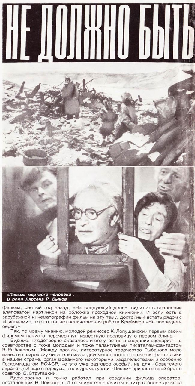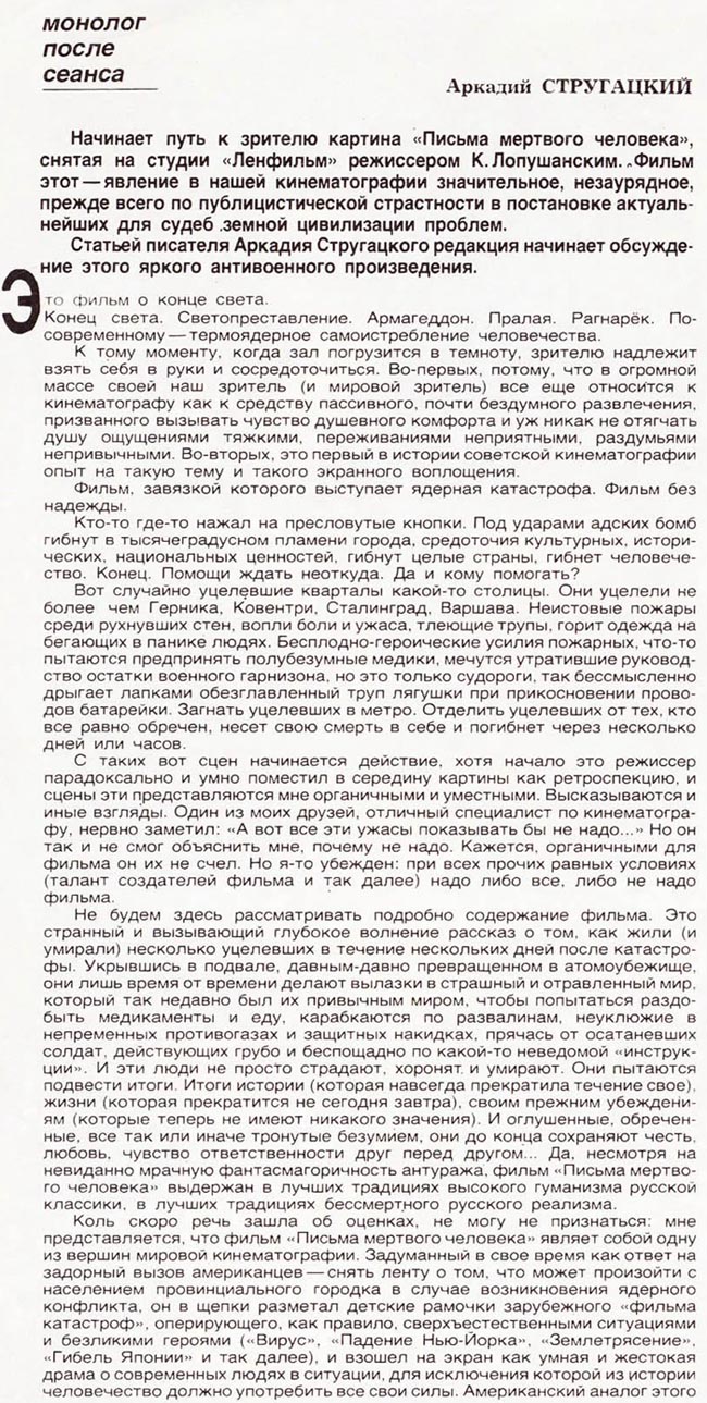 В журнале "Советский экран" (№ 17 за 1986 год, стр. 2-3) напечатана статья Аркадия Стругацкого об этом фильме. Так как журнал был полноценным таблоидом большого размера, то статью порезал на колонки:
