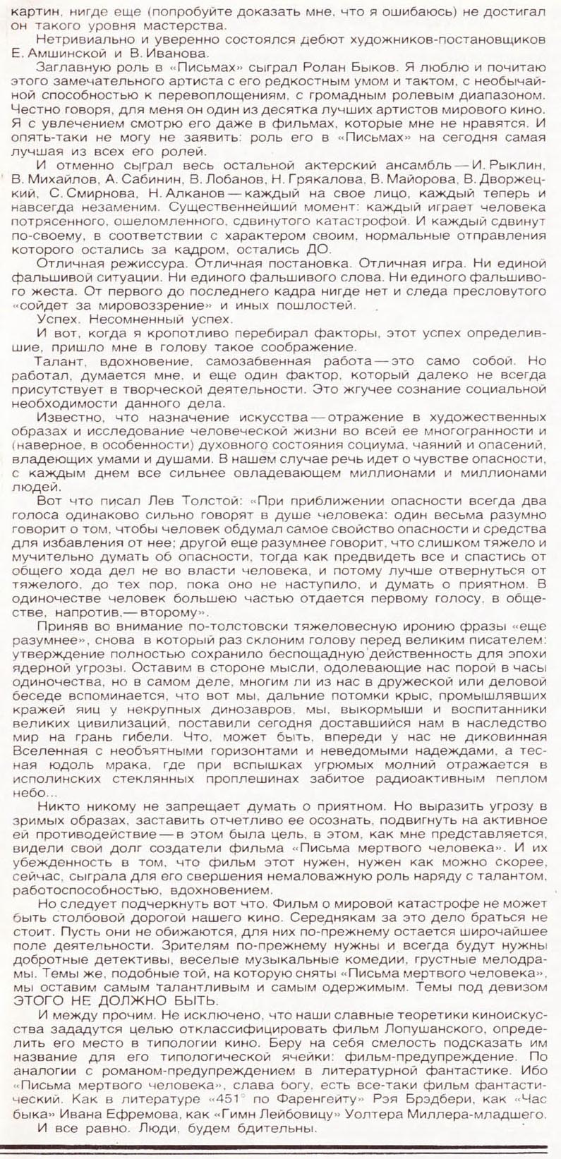 Мрачная последняя история о крохотной горстке умирающих в бомбоубежище детях, где с потолка сыпется радиоактивный песочек, тронула зрителей посильнее антифашисткого "Иди и смотри" Климова. По советскому телевидению был устроен парный показ этих двух лент (американского "На следующий день" и советского "Письма мертвого человека"), с обсуждением в студии со зрителями. Несомненно художественные произведения тех лет сильно повлияли на общественные настроения и процесс мирного разоружения конца 1980-х.