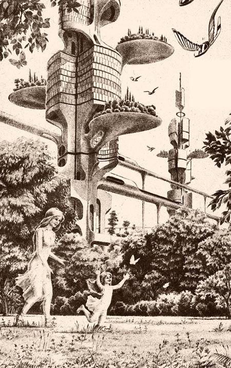 В значительной части картин люди на нашей Земле в намордниках, в противогазах, родители детишек за руку держат смотрят на старт ракеты, оба опять же в химзащите, кругом помойки, даже на колонизированной Венере, и ружья нацеленные в людей, а если совсем технологическая ткань общества истлела до средневековья — то и просто биты с дубинками. Не, такого будущего не хочется. Книга имеет знак "18+", и это если вдуматься ужасная помета времени, если такое будущее, неминуемо и логично вырастающее из текущего настоящего, детям показывать вредно.