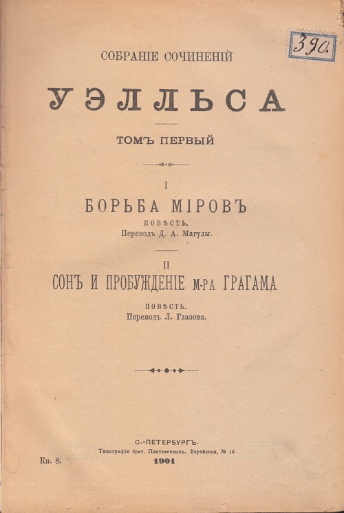 Обложка первого тома самого первого собрания сочинений Уэллса на русском языке, типография братьев Пантелеевых (1901 год, издано 3 тома)
