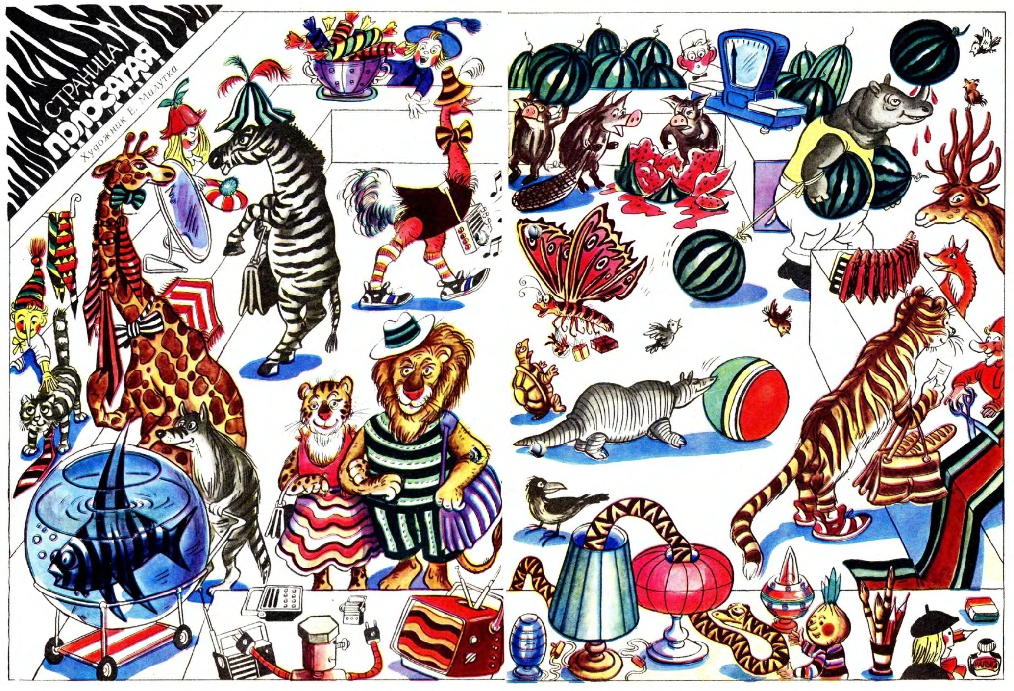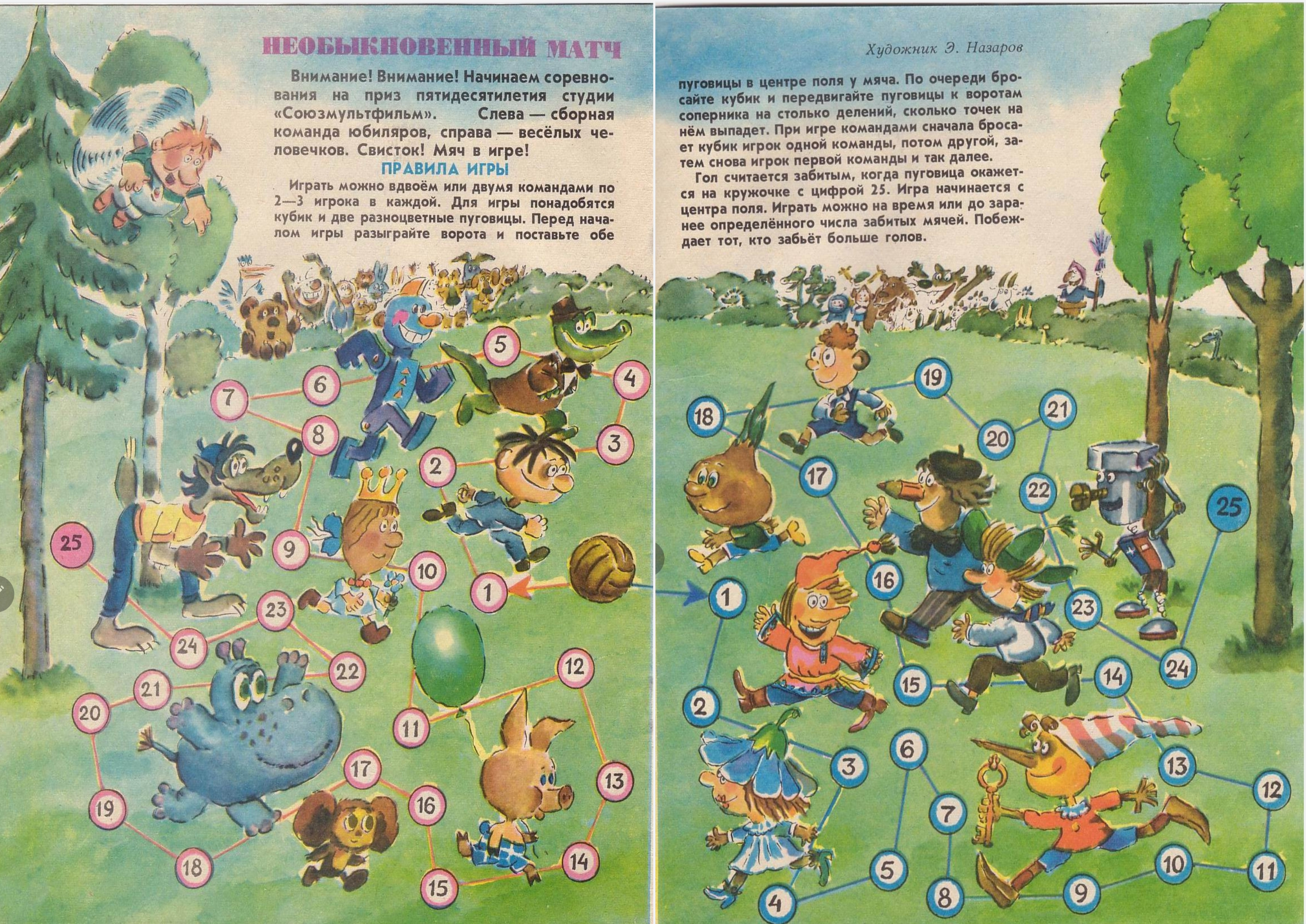 Божественный Э.Назаров — создатель персонажей многих мультфильмов (они на левой стороне разворота). В своей неподражаемой манере сделал он и весёлых человечков (они на правой стороне).