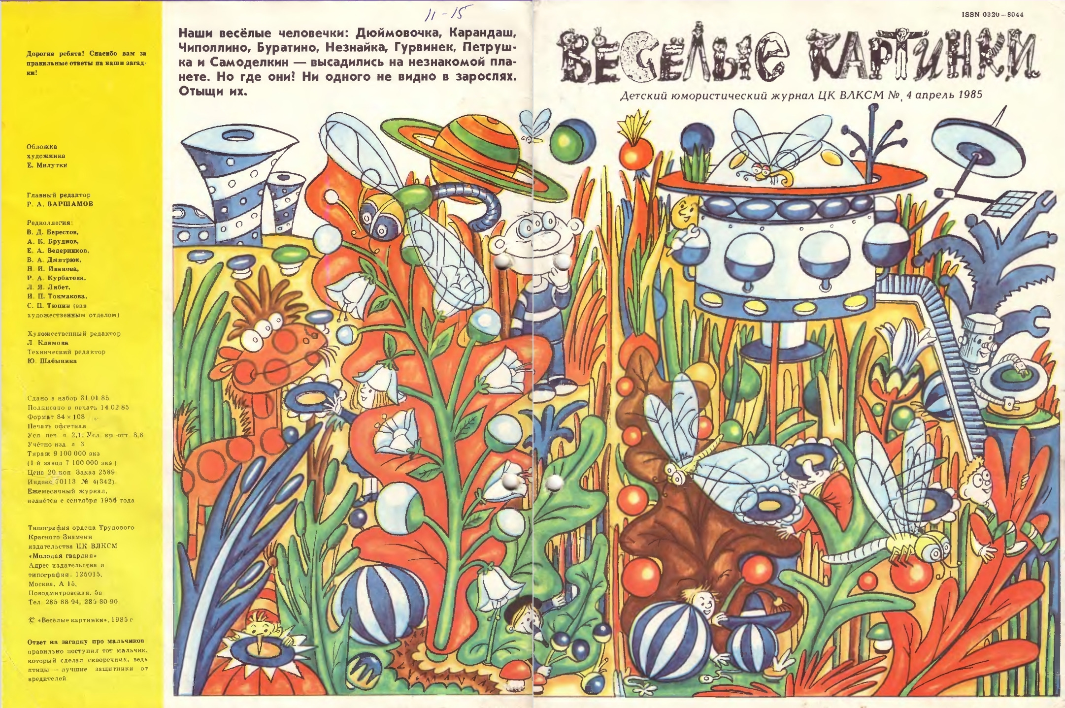 Милый анахронизм: битва за урожай. В последний раз весёлые человечки помогли колхозникам. С поля тащат целый батон (а раньше снопы носили). Новая художница Е.Гладикова — весёлые человечки забавные, в стилистике второй половины Восьмидесятых (что-то общее с коротышками братьев Ружо их книг про Незнайку).