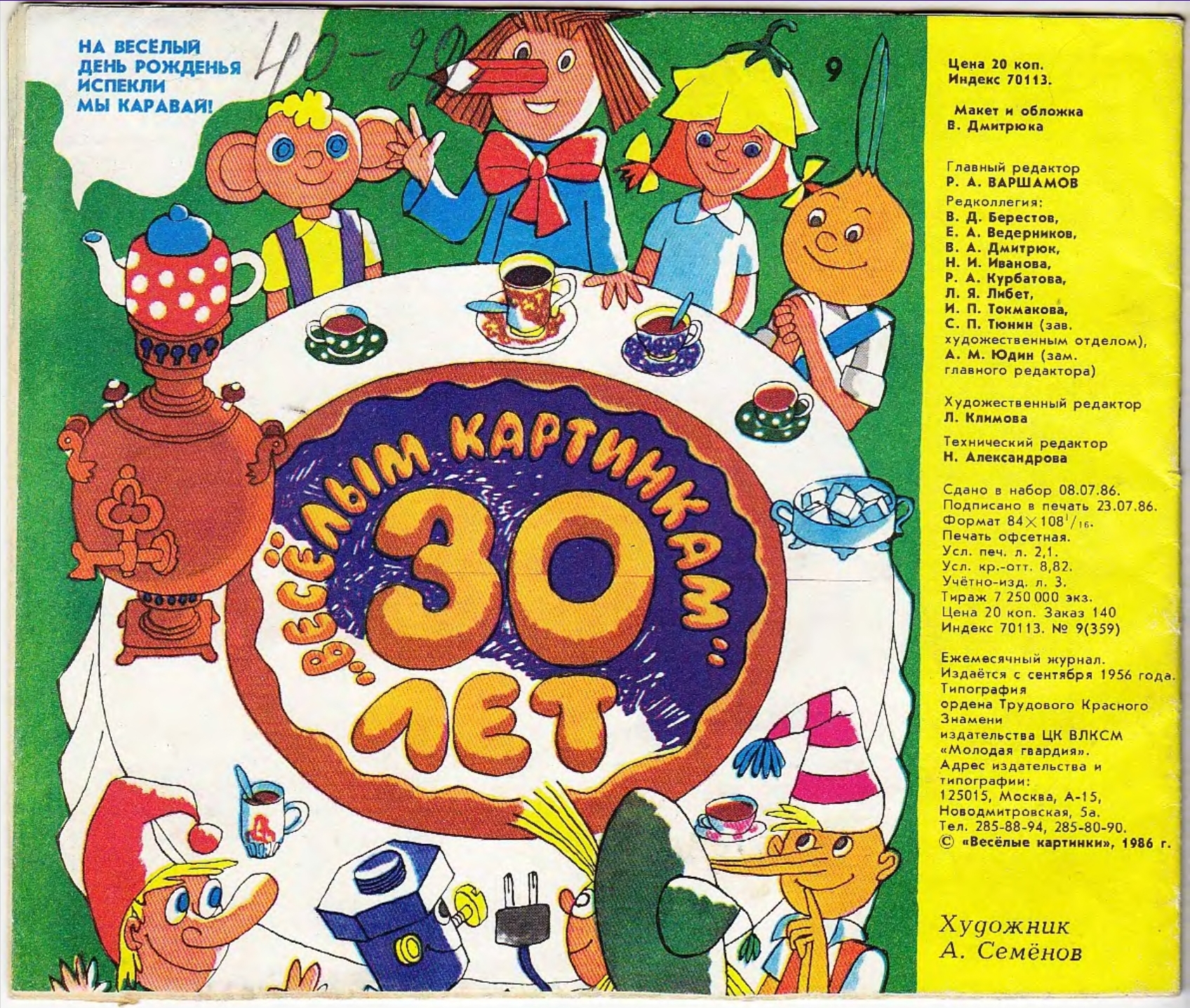 Журнал в 1986 году отмечал 30-летие. Особых торжеств не было, новых образов для весёлых человечков не выдумывали. Юбилейные картинки дали как художники среднего поколения (А.Семёнов), так и новые художники (Е.Милутка)