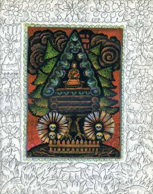 Страничная иллюстрация: момент ухода Василисы от Бабы-Яги с черепом. Обычно художники в этой сцене саму-то Бабу-Ягу не рисуют. Но, думаю, здесь сказалось влияние текста, который грамотно модернизирован.