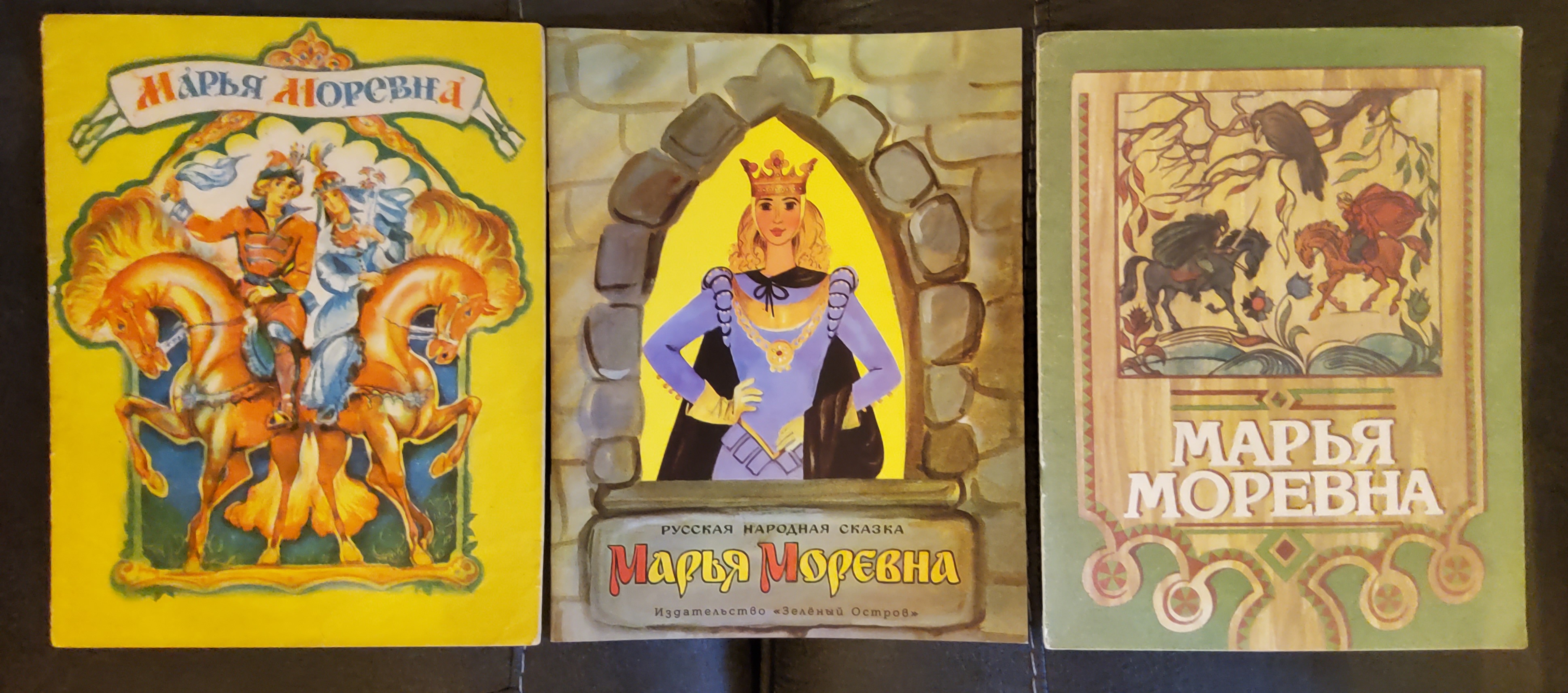 В центре: "Марья Моревна" в современном переиздании от "Зелёного острова" (2016), а первое издание было в 1990 году (М.: Малыш). Очень известная художница Т.Шеварёва. Работала в центральных издательствах, но в Интернете и о ней сведений, кроме даты рождения, нет (а последний том энциклопедии Чистобаева ещё не вышел).