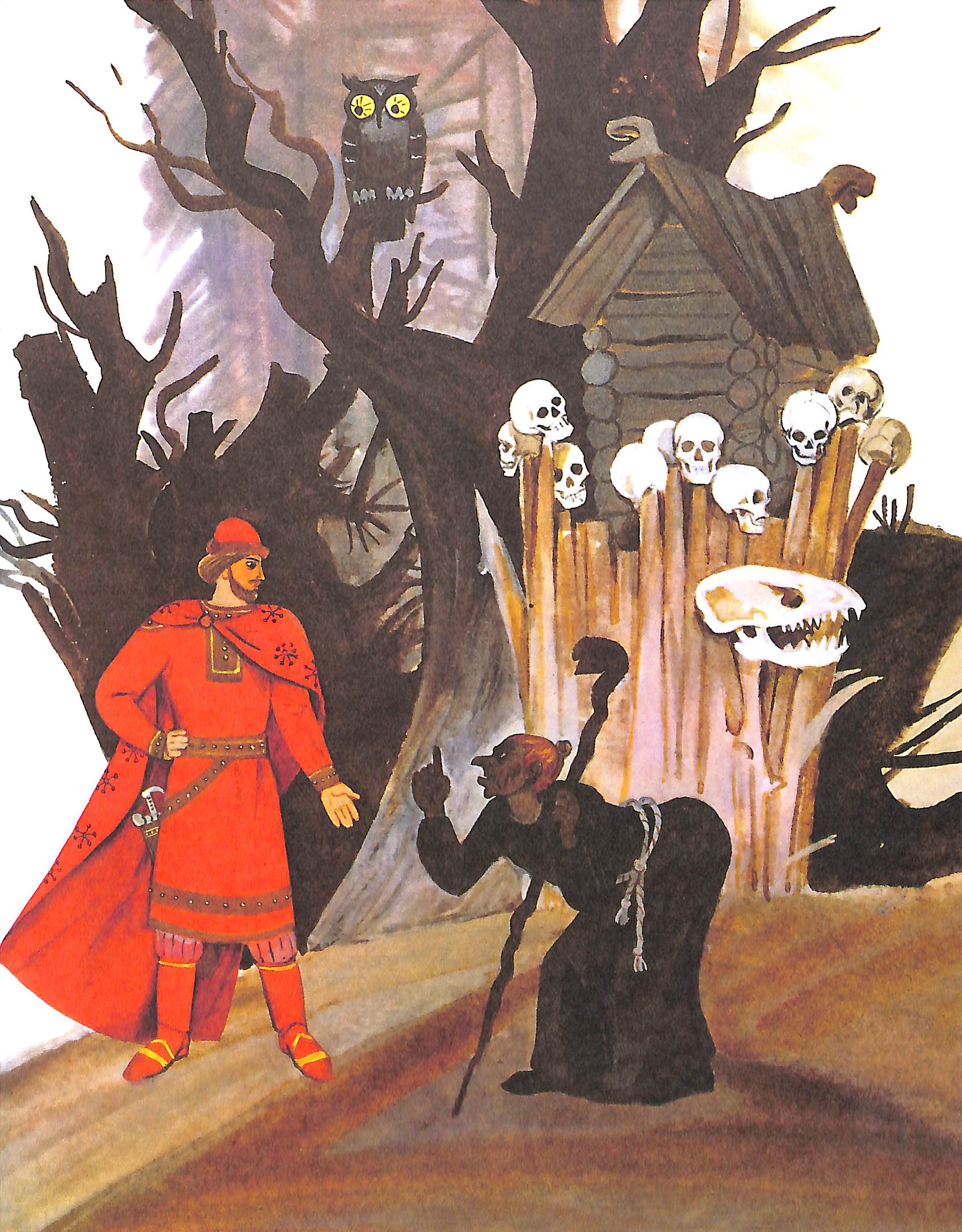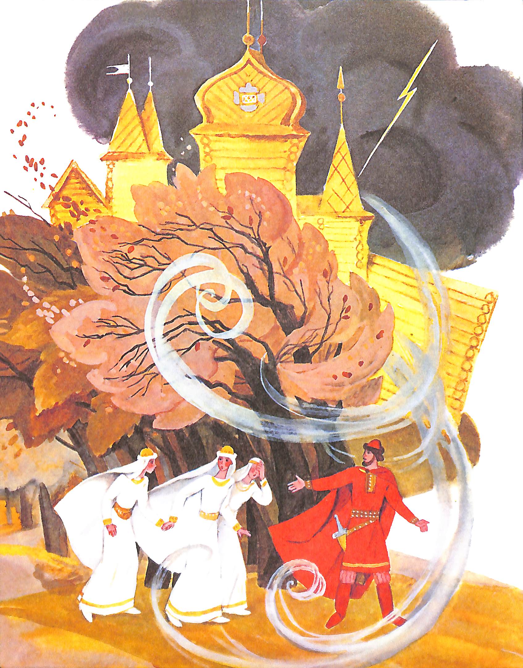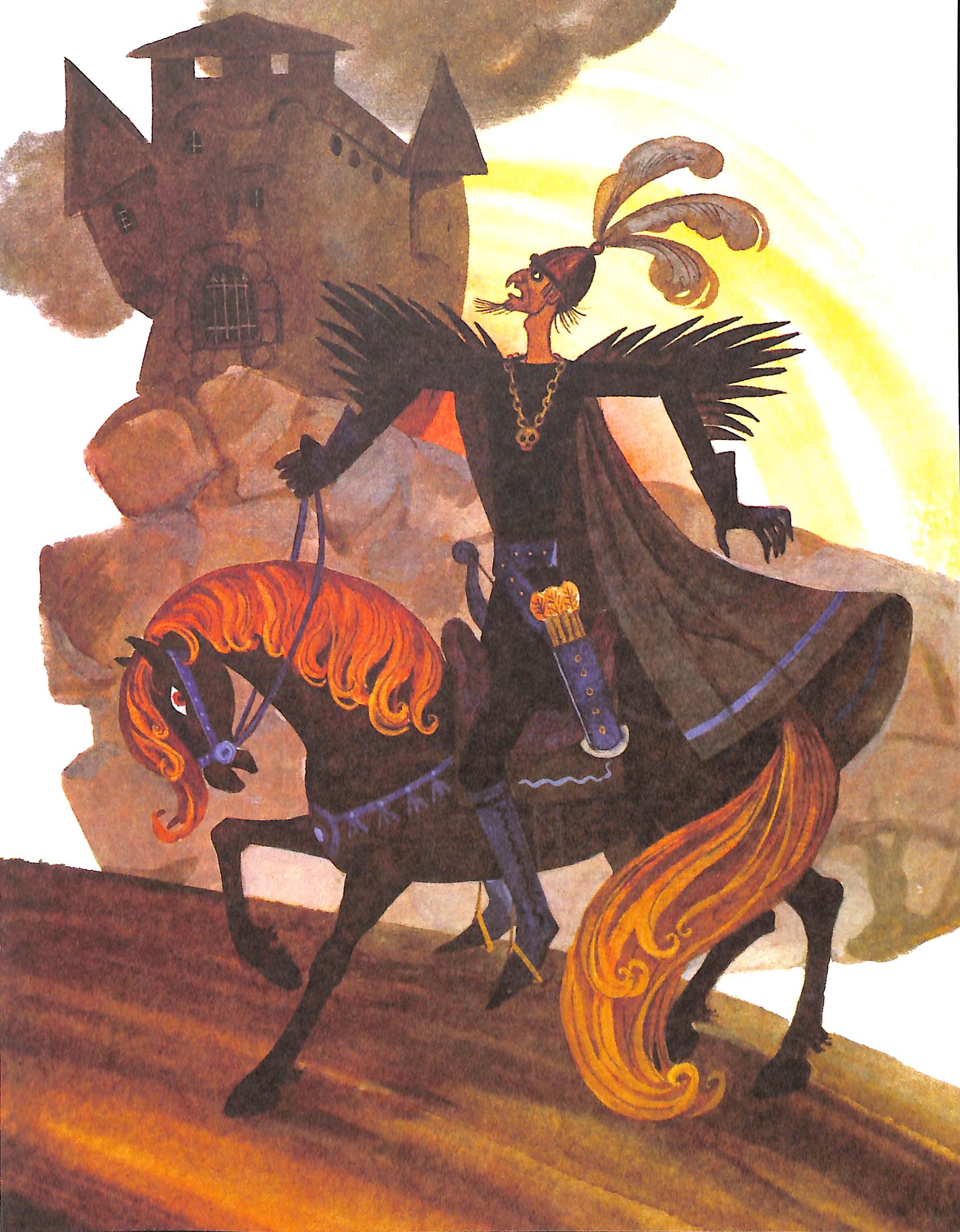 Ещё раз Кощей у художника мелькнёт издали (если не считать фигурки на обложке). И опять на первом месте мрачный пейзаж: художник рисует, что умеет. И пейзаж — единственное сказочное в этой книжке.