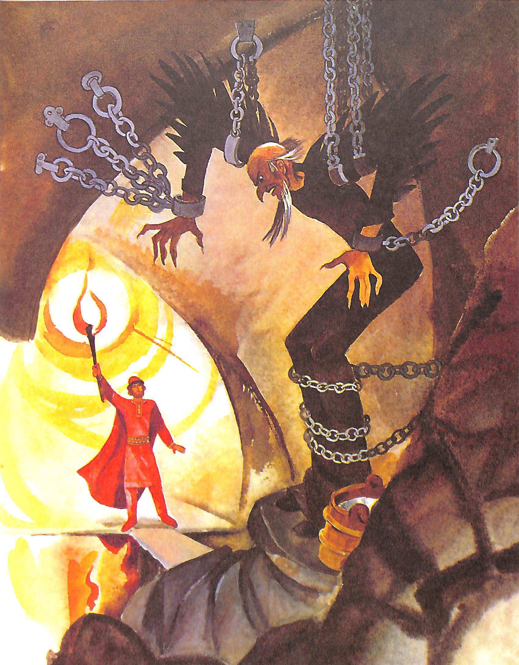 В отличие от отвратительного Кощея вурдулачьего типа у Билибина, советские иллюстраторы Кощея несколько идеализируют. Он подтянут, грозен, а у Шеварёвой и несгибаем (на цепях-то совсем скукоженный должен быть — а он вон каков).