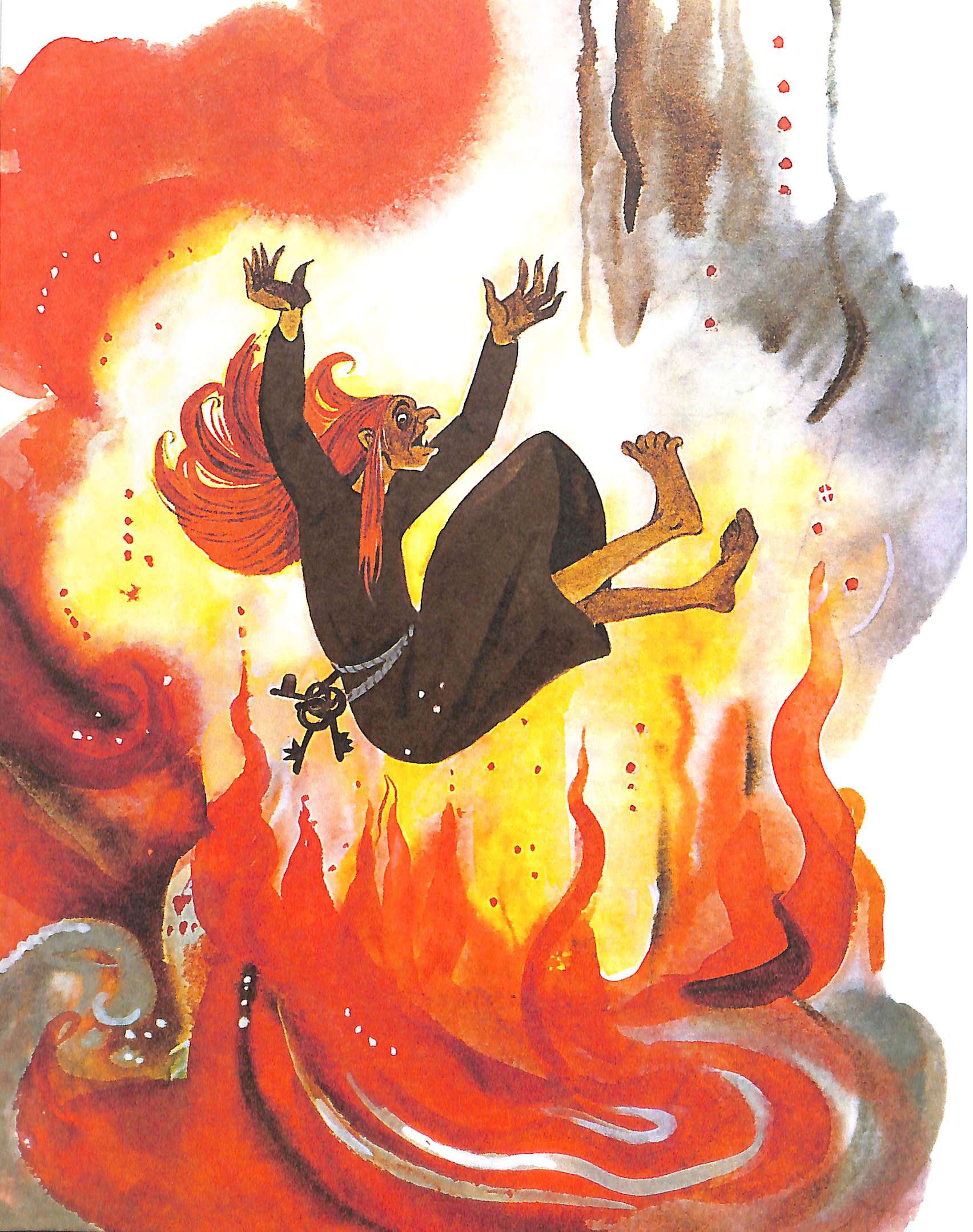 4) А Бабу-Ягу женщины не любят — значит, и никто не любит. Но Баба-Яга — тоже центральный персонаж, ей Шеварёва тоже две страничных иллюстрации отводит. И не боится показать гибель ведьмы в огне.