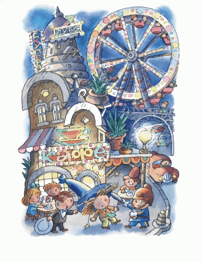 А сам мир Незнайки радостный и карнавальный — как у Калаушина. Здесь Дмитрюк показывает свои корни — новая графика Шестидесятых (но сам Дмитрюк относится к другому поколению художников — свой собственный стиль он выработал в Семидесятые).