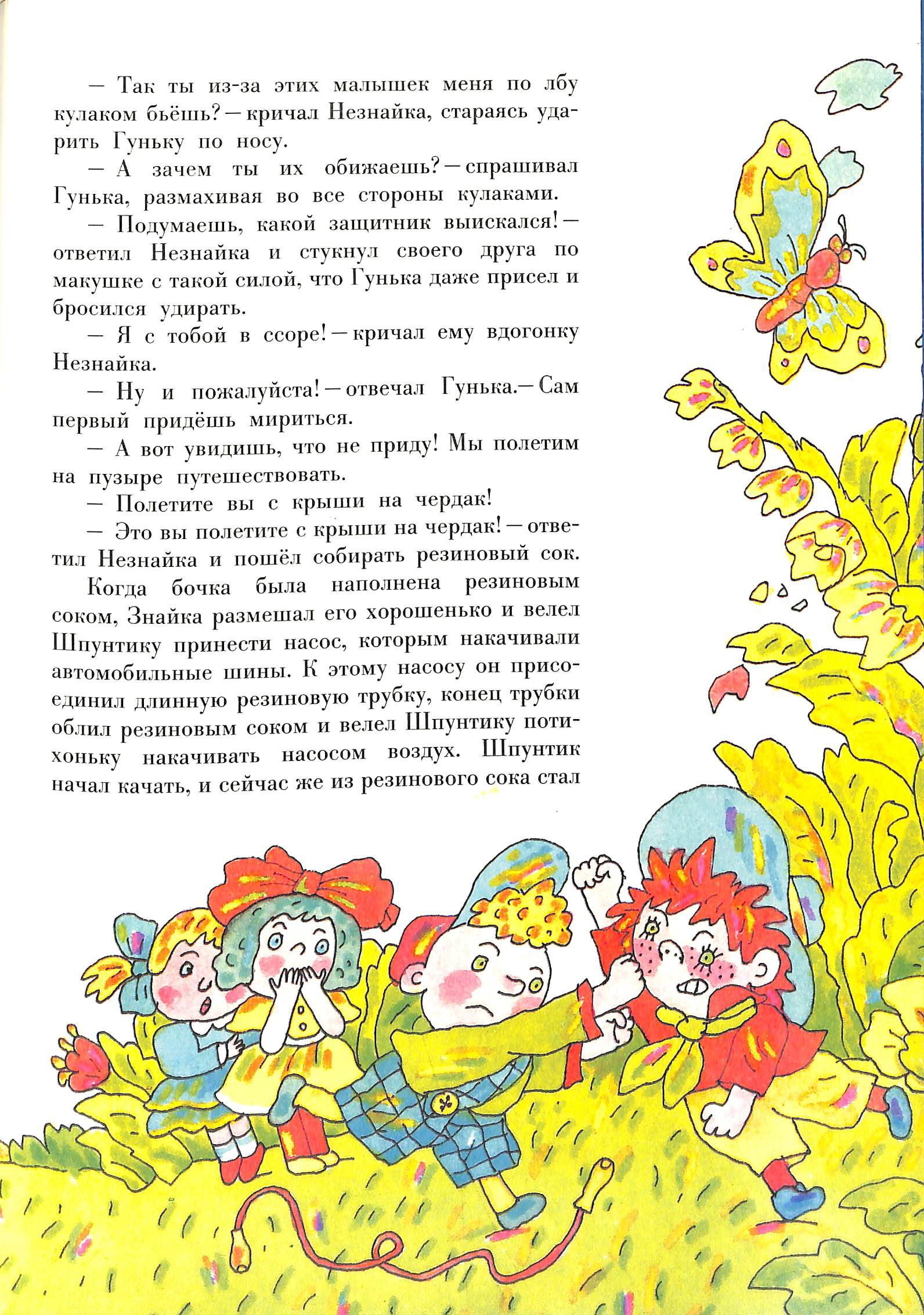 У разных художников обращаю внимание на дружескую драку Незнайки с Гунькой из-за девчонок. С 1970-х гг. наметилась тенденция сглаживать в иллюстрациях эту драку. А у Дмитрюка — нет. Друзья не пихаются, а бьются по-настоящему — и очень сосредоточенно.