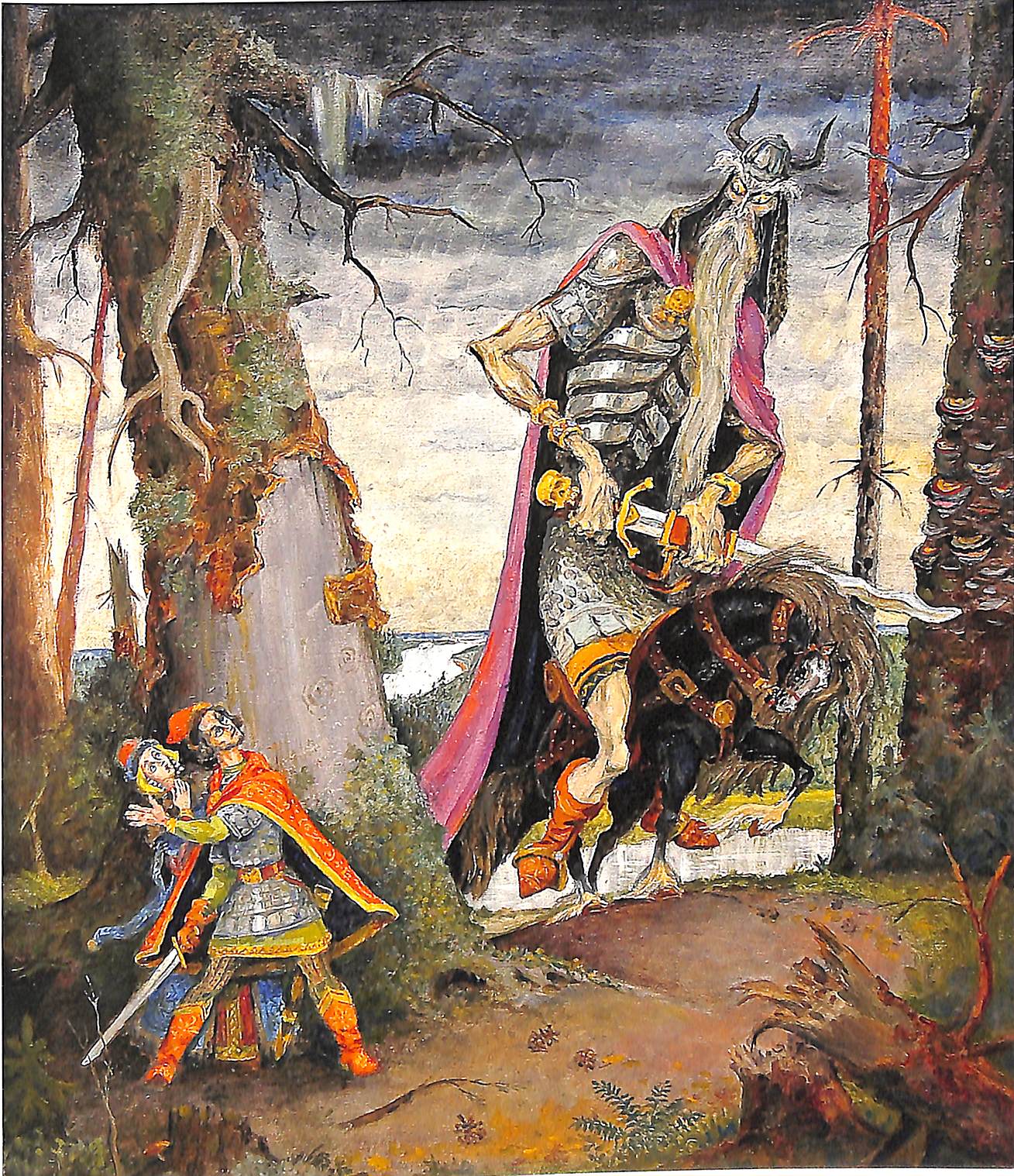 Вроде бы жутковат гигантский Кощей, прямо-таки подпирающий под себя коня, но посмотришь на его костлявые голые коленки — и смешно!