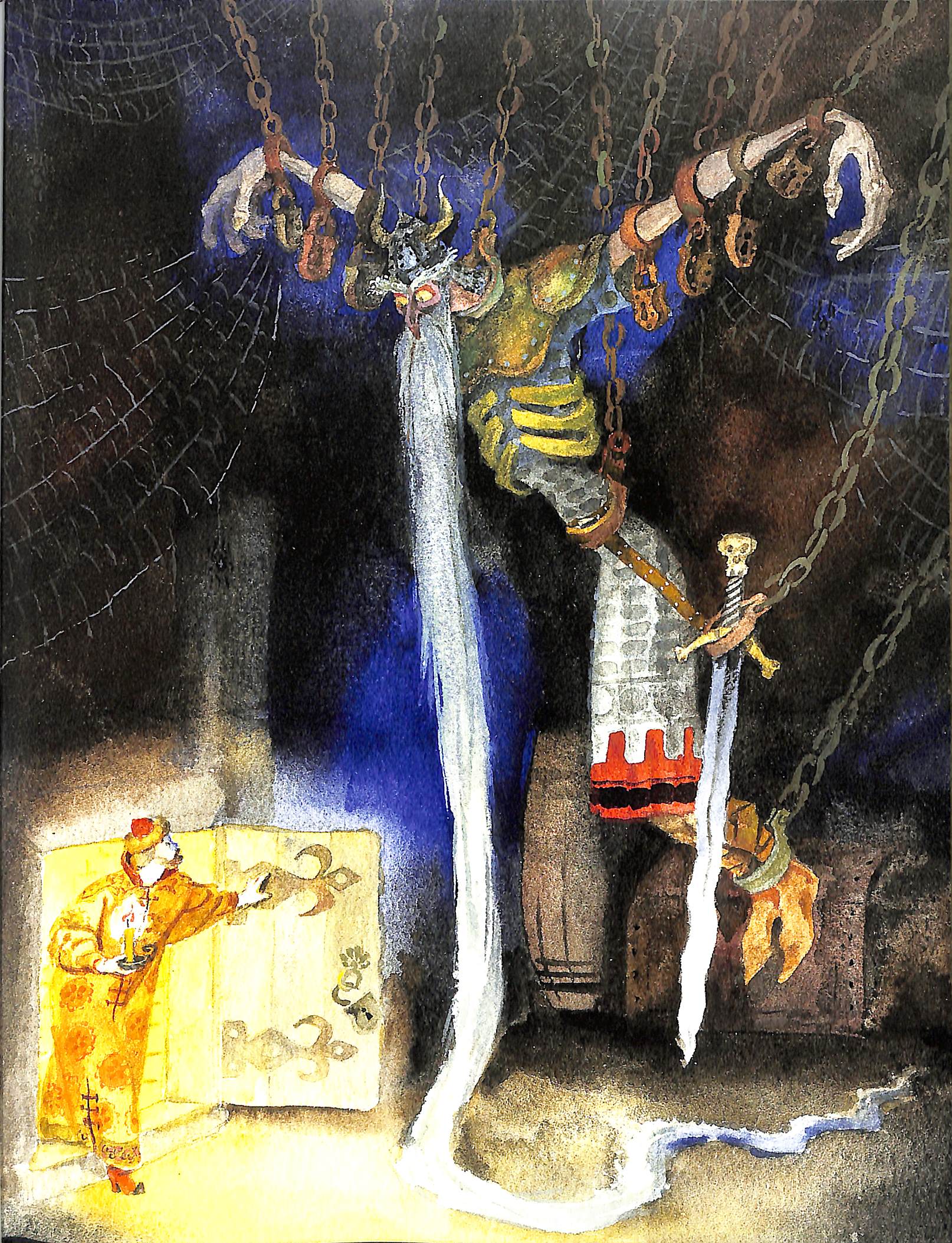 А через много лет Забирохин эту сцену повторил для "взрослого" сборника сказок. Теперь уже и вместо лица — череп, и усы обвисли, и одежда — саван. Чужд этот Кощей миру людей (хотя в сказке он какую-то признательность способен высказывать: два раза прощал Иван-царевича за покражу Марьи Моревны, и только в третий раз порубил).