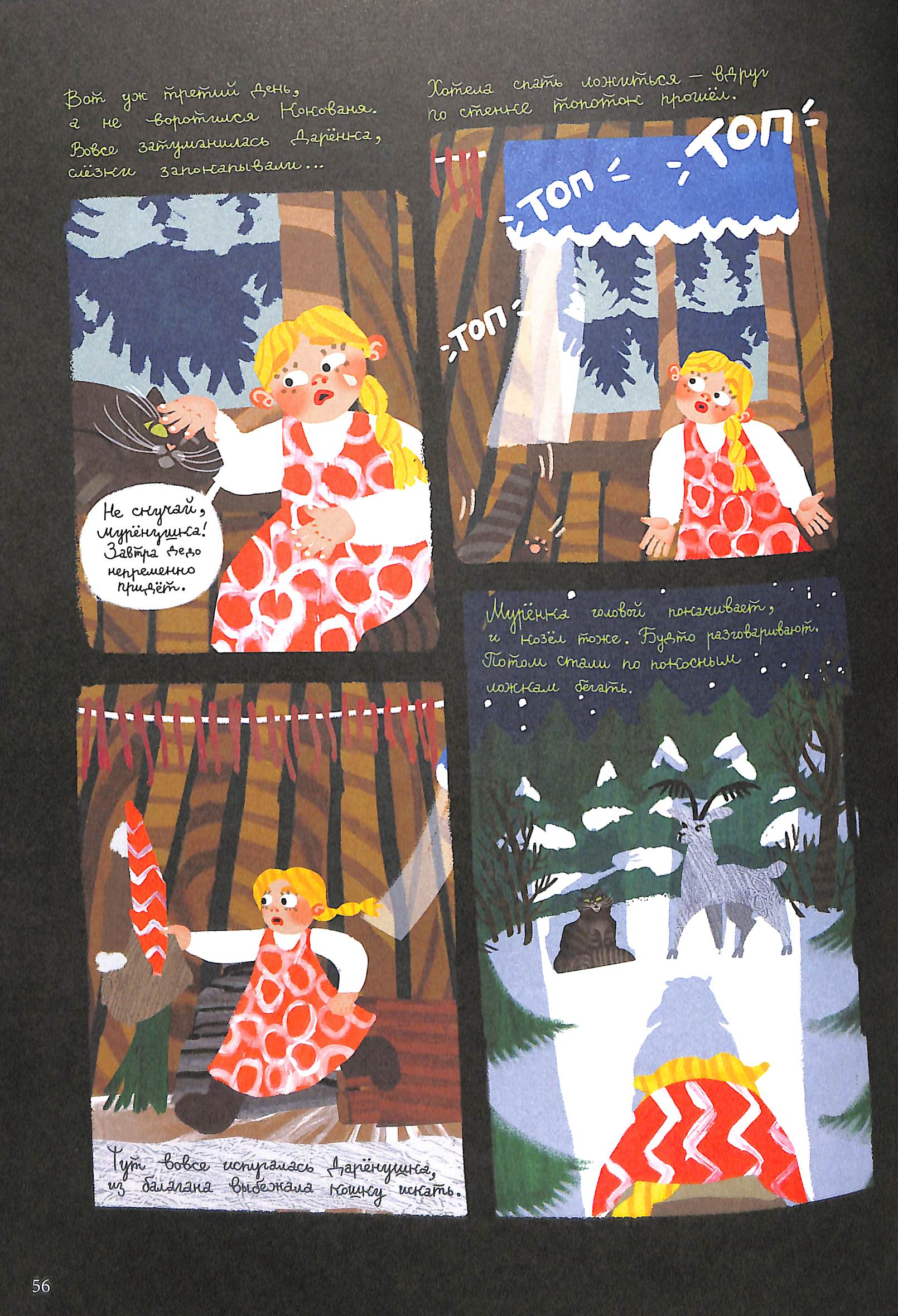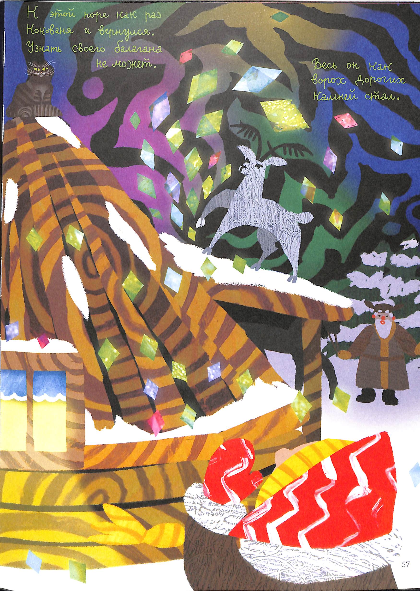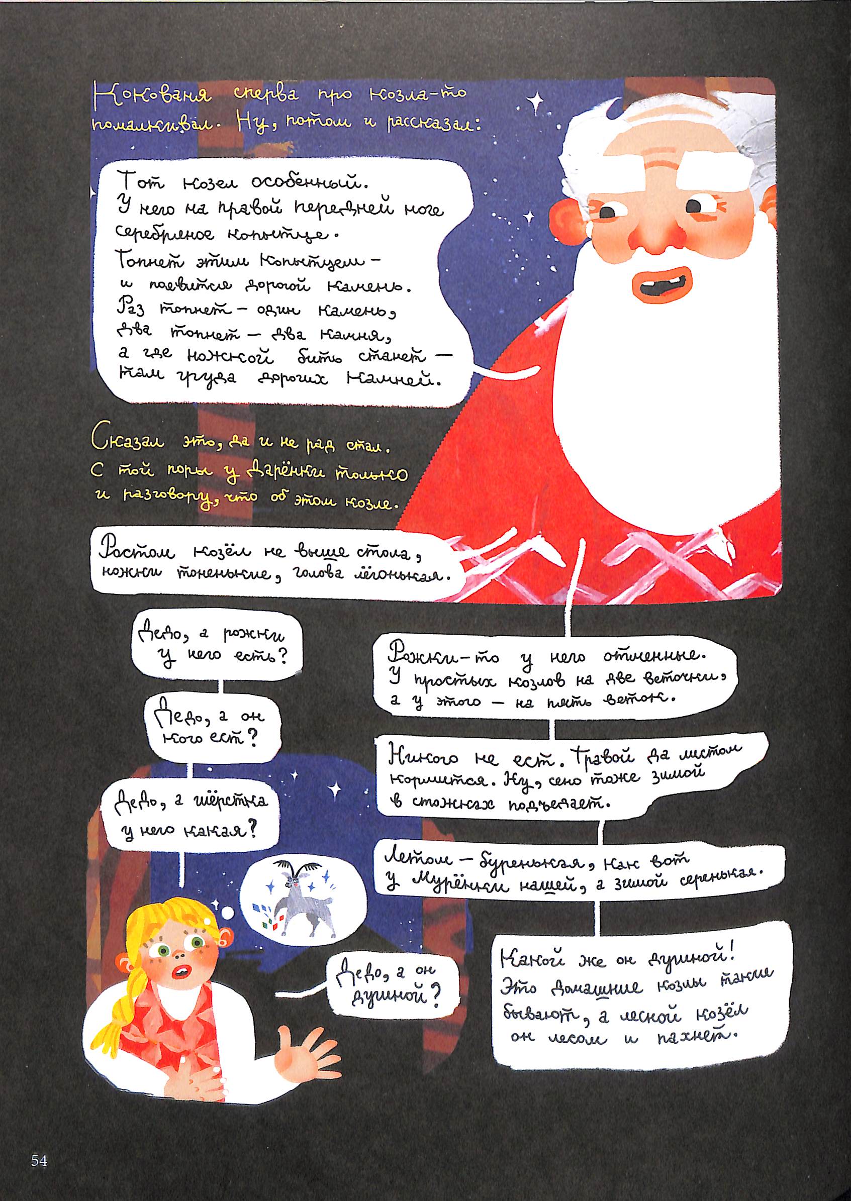5) Страничная иллюстрация — апогей истории. Ярко, пёстро. В глазах мельтешит — но так бы и было при той новогодней иллюминации, которую устроил козлик. Вот эту картину вполне можно представить себе в виде современного графити на стене многоквартирного дома.