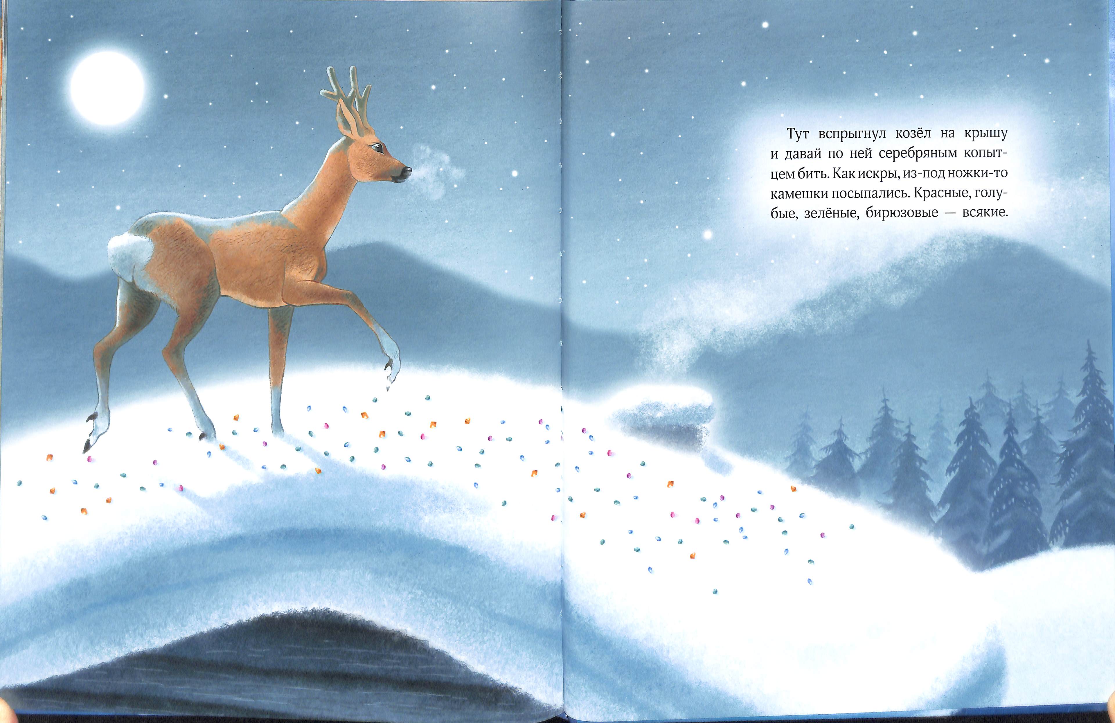 Художница трезво подошла к количеству камней, которые козлик был способен выбить одним копытцем. Редкий случай в иллюстрировании "Серебряного копытца" — отказ от волшебной феерии. Тогда и радость Коковани с Дарёнкой — это не праздничный восторг от ночного сияния, а удовлетворение от сбывшегося желания повидать редкого козлика.