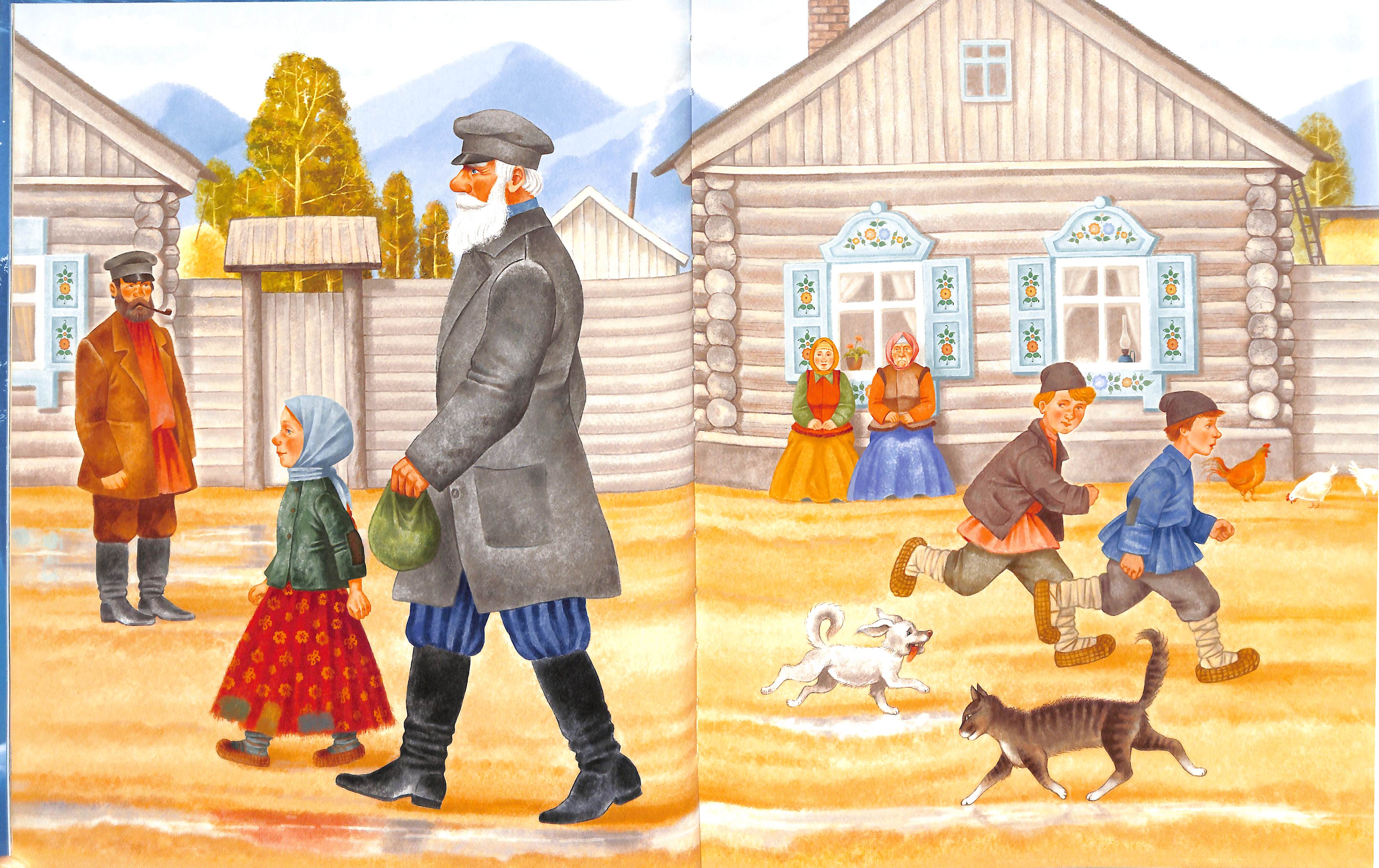 1) Кокованя забрал сиротку Дарёнку из приёмной семьи вместе с кошкой и ведёт её к себе домой. Художники по порядку: а) Дамбиева, б) Доменикони, в) Бычков, г) Емельянова.