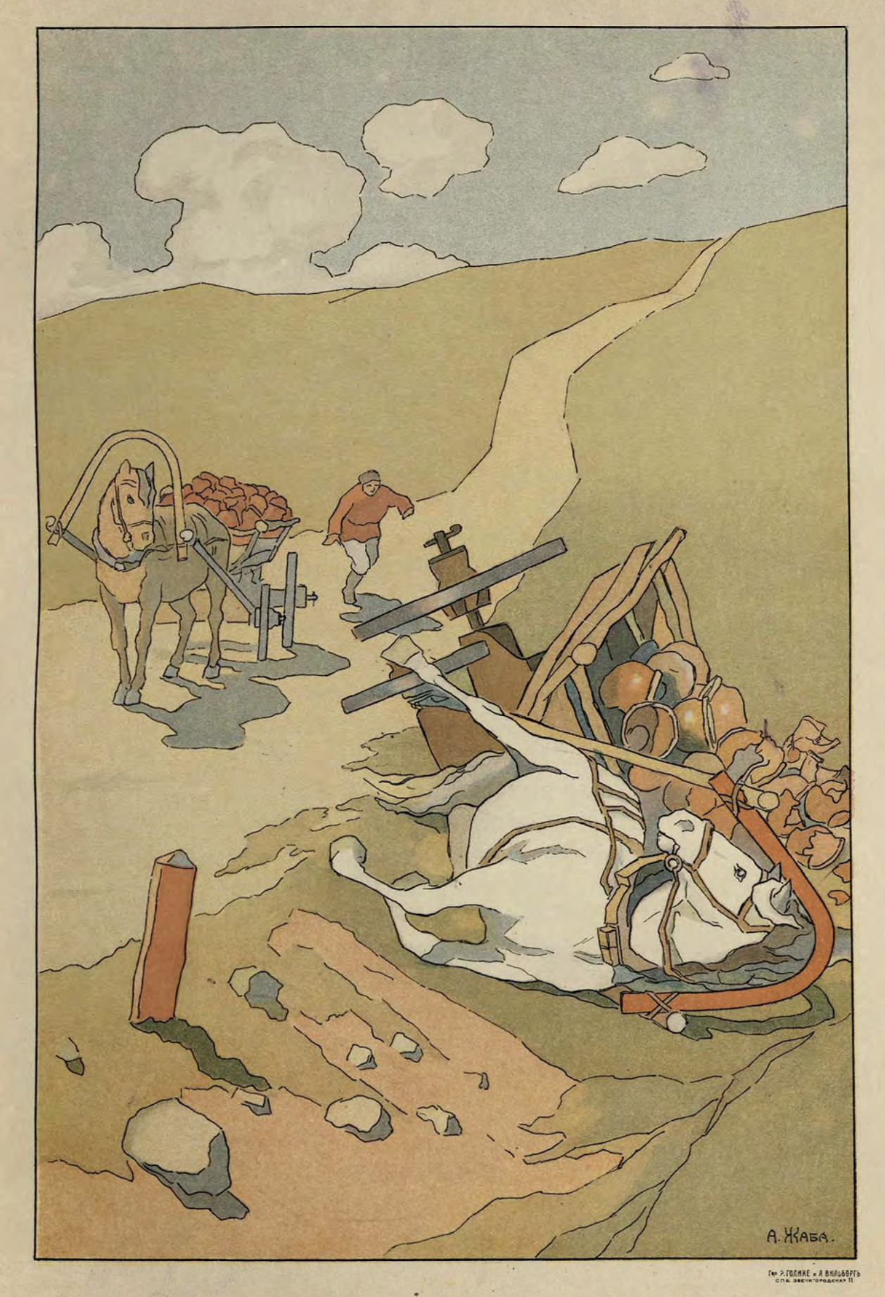 Художники, отошедшие от исторической первоосновы басни, рисуют драматический момент. Молодая хвастливая лошадь спускается с горы быстро, не может удержать разогавшийся воз, падает, бьёт все горшки. Жабá рисует натуралистическую сцену.