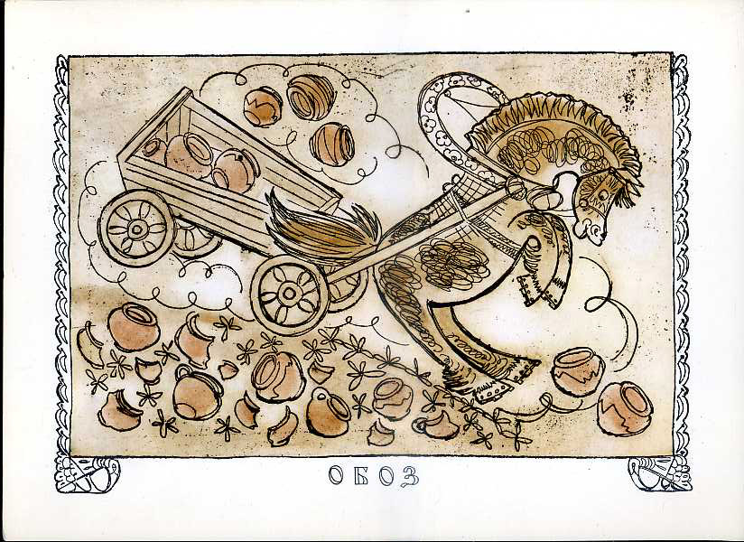 Классно Нарбут нарисовал: огромная курица на возу, а кучером — человек таких же размеров. А вот ворона — обычных размеров. Её же французы есть будут. Нехорошо получилось бы, если бы Нарбут её как курицу нарисовал: с человечьим телом и размером с человека. Канибализм ведь будет.
