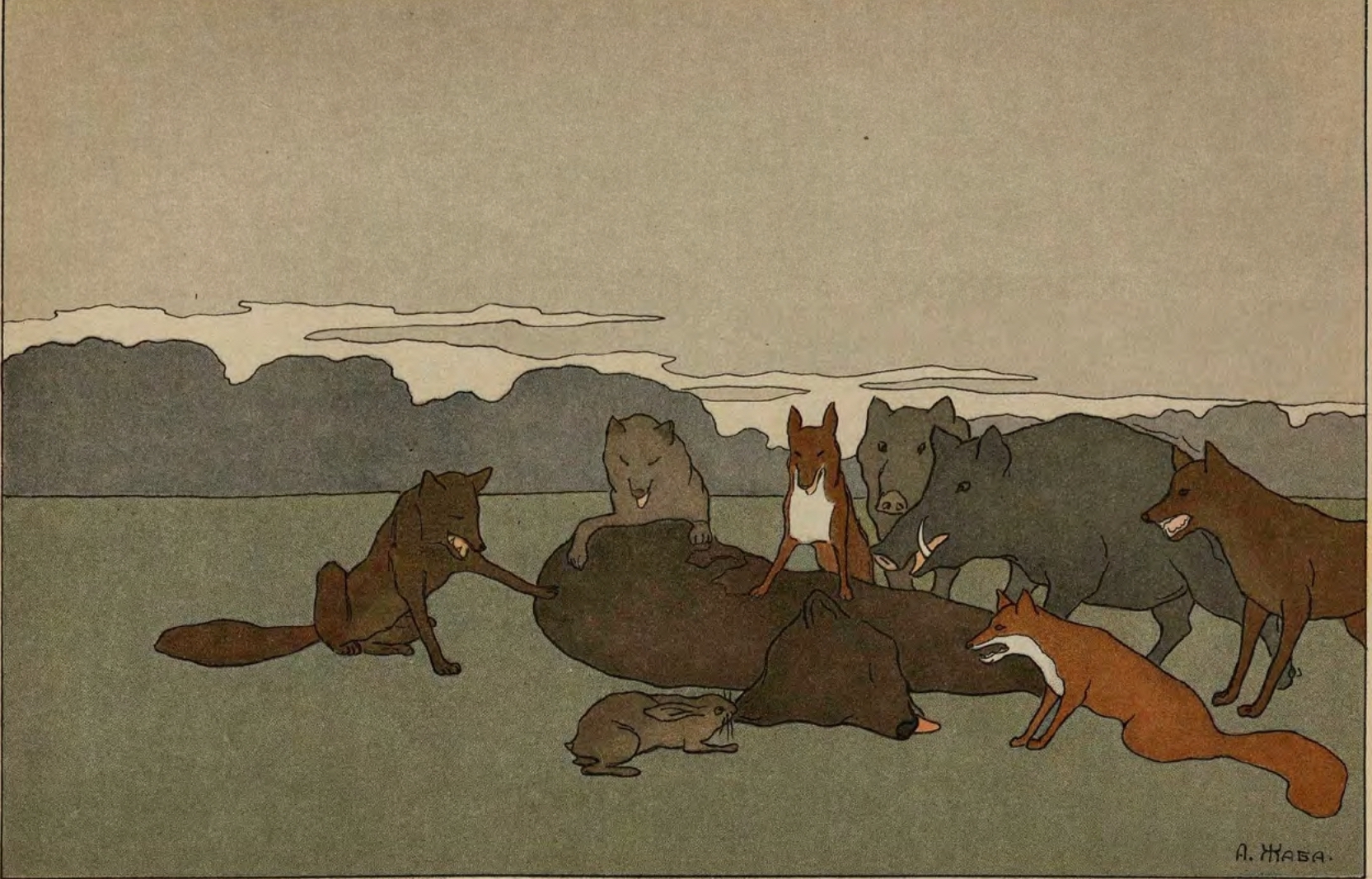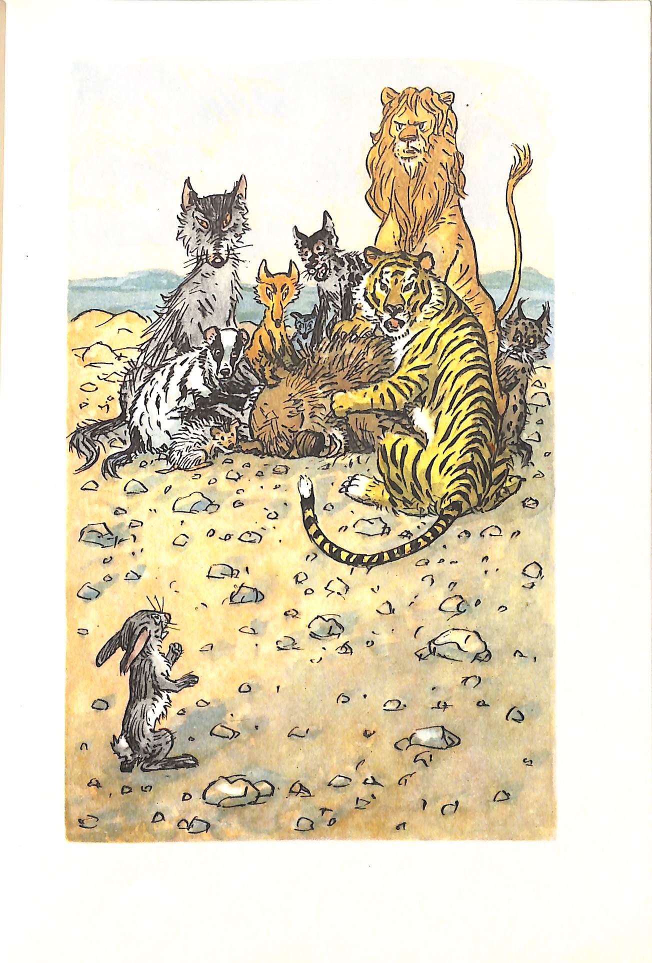 5) Митурич неожиданно дал очень жёсткую картинку. Страшный Лев с запавшими глазами и омерзительный Заяц с человечьим лицом. Всё-таки очень странные иллюстрации. Как будто лиричный Митурич сам находился в бешенстве от того, что его заставили иллюстрировать сатирическую муть.