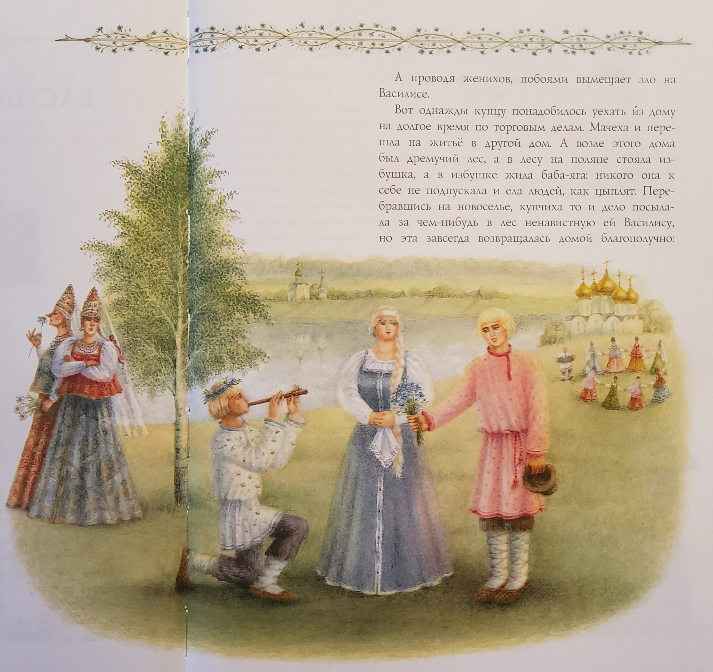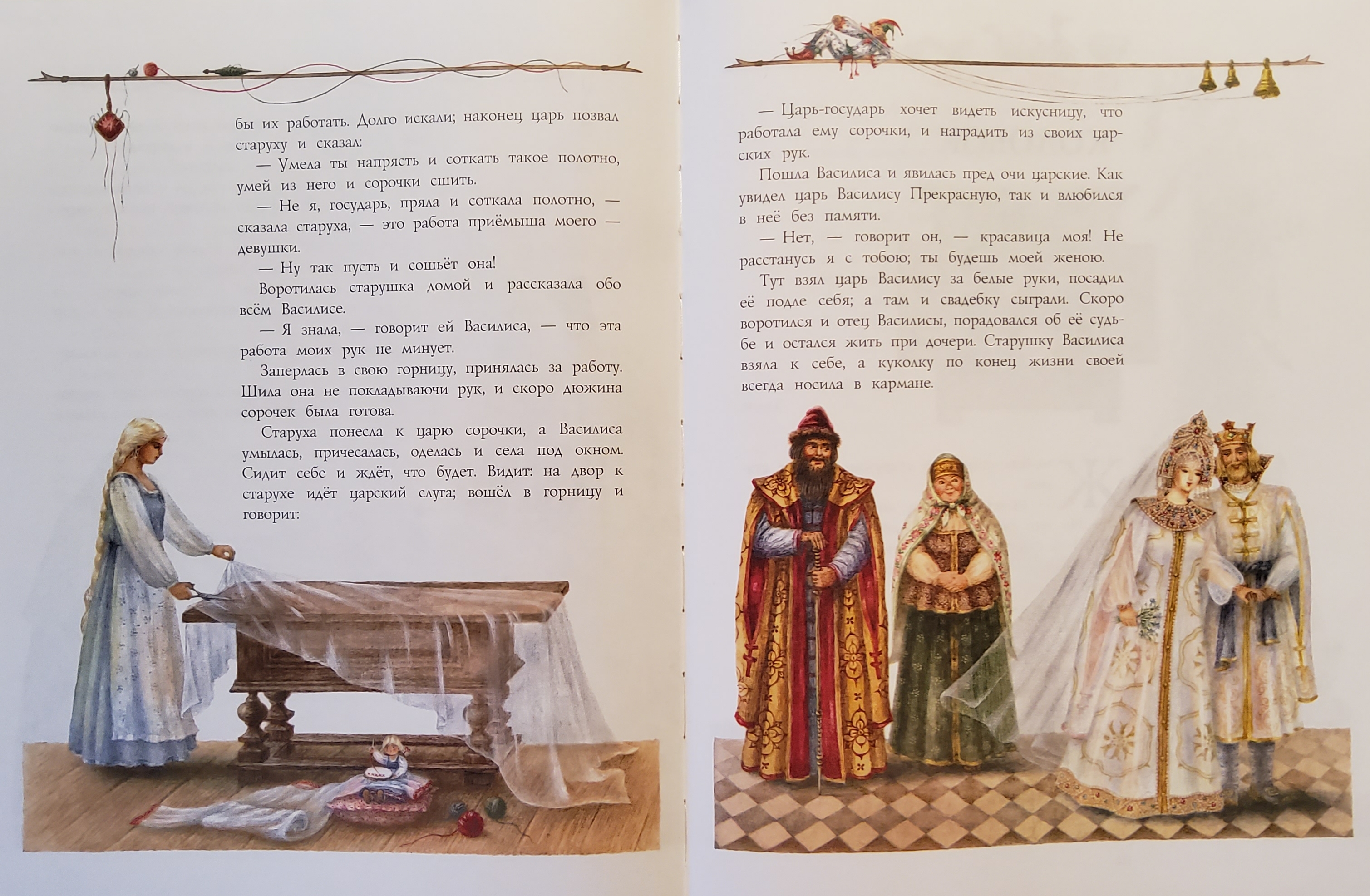 "Василиса Прекрасная" в иллюстрациях Марианны Беляевой. С подозрением относился я к этой художнице: смешение сталинского послевоенного стиля (если людей рисует) с мультяшной пупсовостью (если зверей рисует). Народ на некоторых форумах заподозрил художницу в китче.
