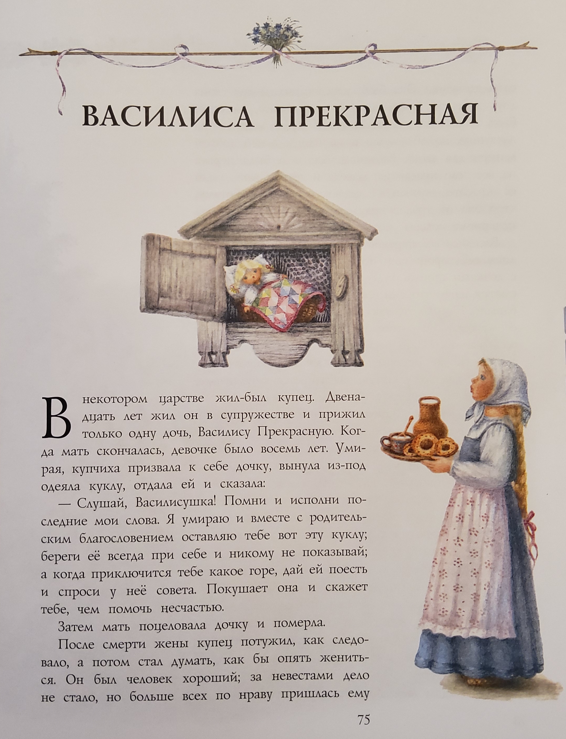 Первая страница настраивает на традиционный лад: маленькая сиротинушка Василиса с куколкой. У куколки затейливый домик, а в руках девочка еду для неё держит (куколку надо было кормить). По тексту сказки и Василису-то недокармливали, так что уделить долю куколке — это была самоотверженность. На рисунке пайка для куколки солидная.
