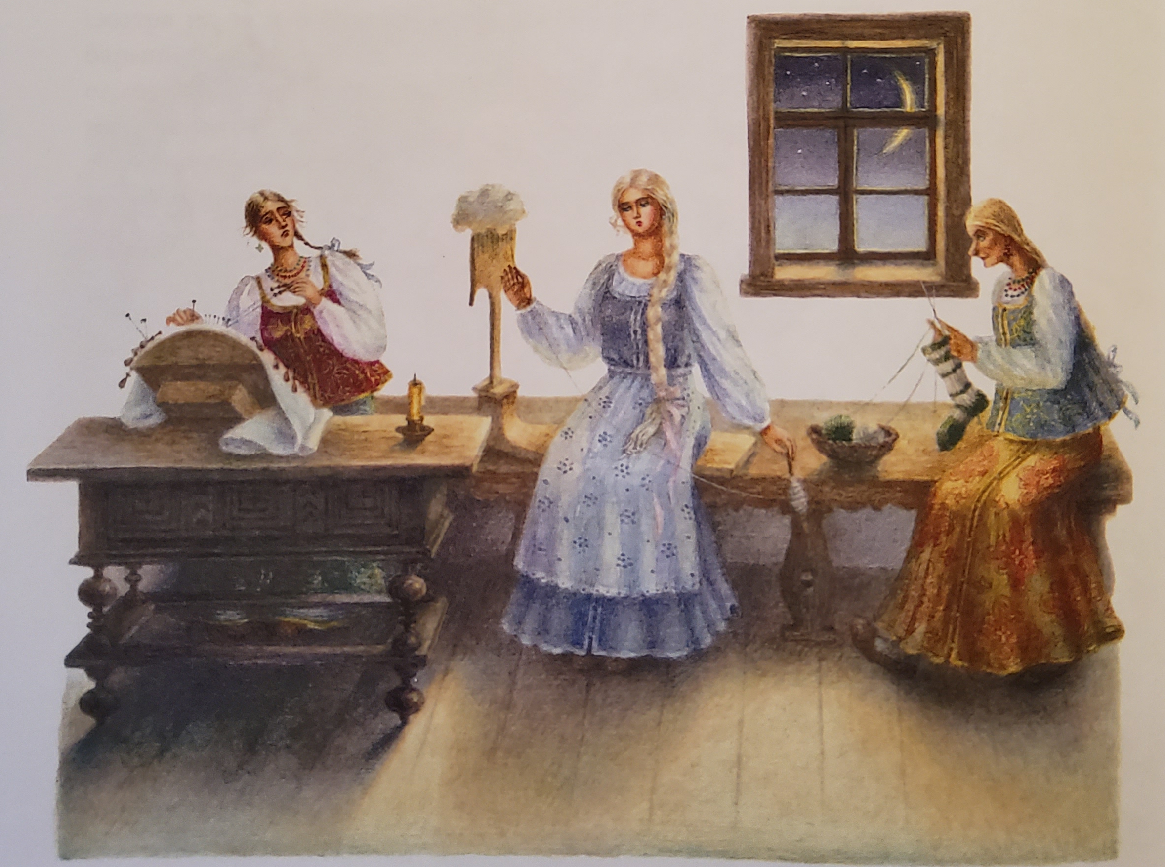 Василиса всё переносила безропотно и с каждым днём всё хорошела и полнела, а между тем мачеха с дочками своими худела и дурнела от злости...