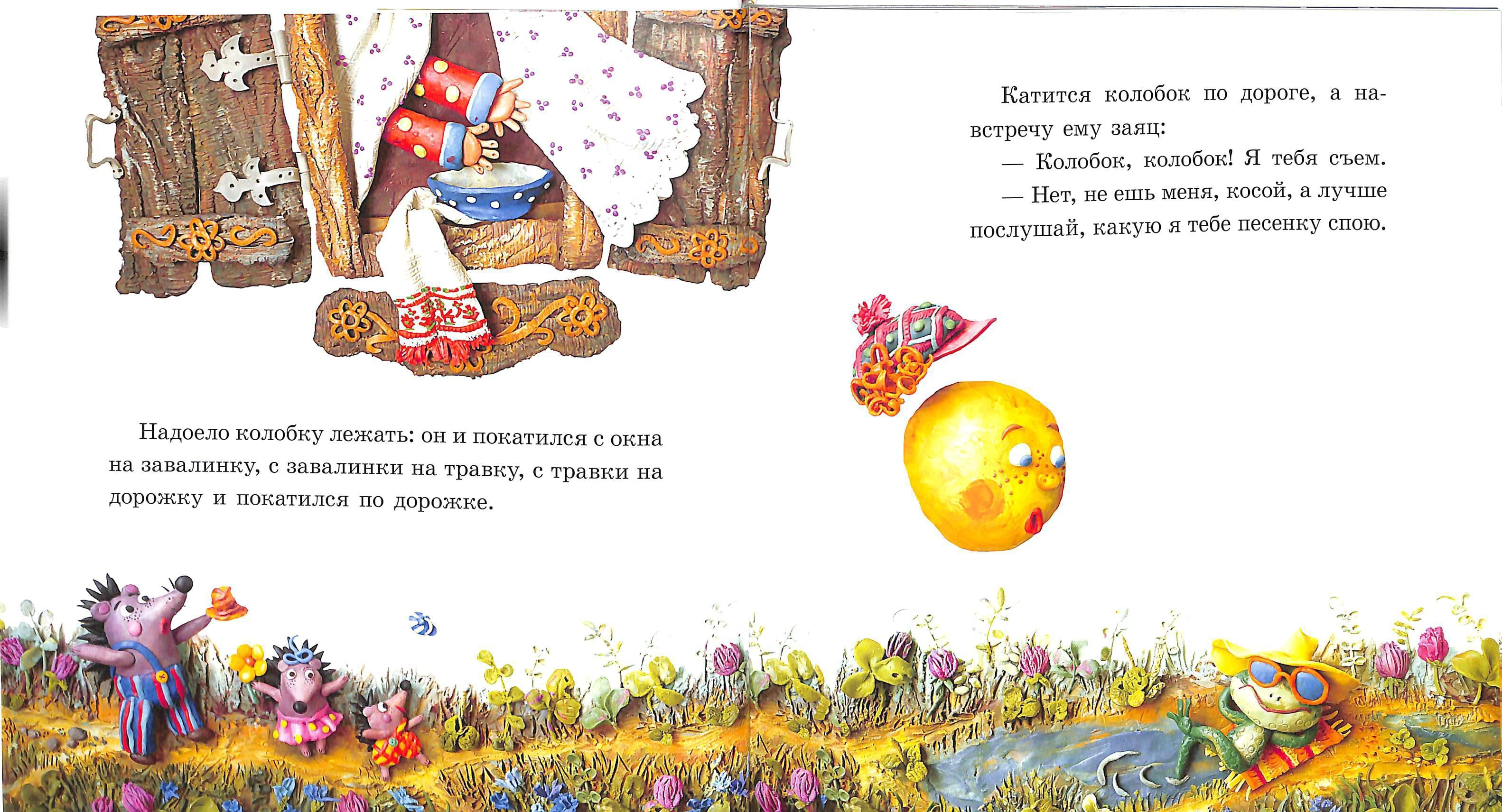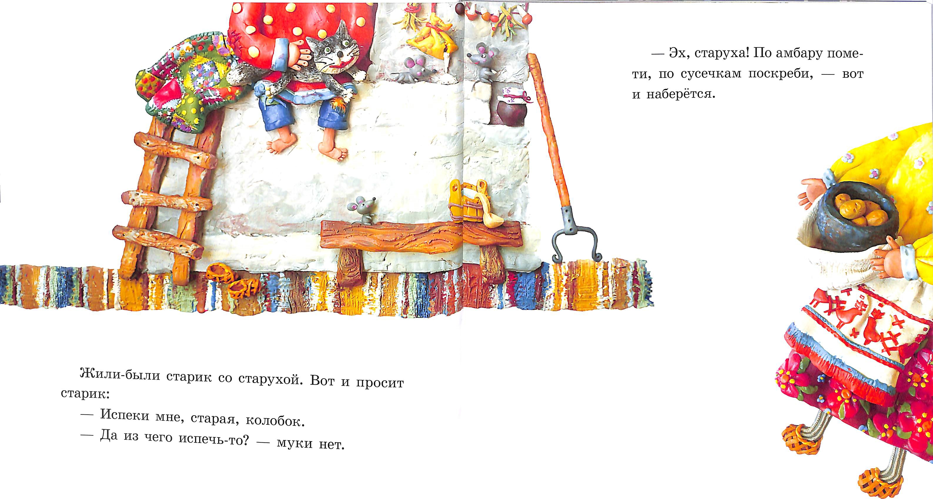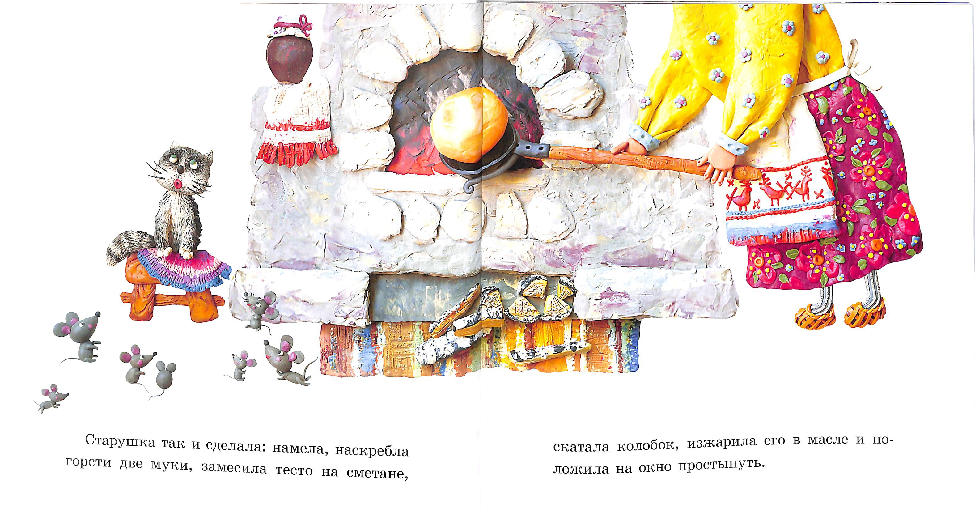 Подробно исследуется начало жизни Колобка. Фигурки деда и бабы показаны на огромном пространстве белого листа фрагментарно, причём фрагменты — все безголовые, механически обрезанные. Это единственный прокол художницы: в погоне за оригинальностью получилось просто оригинальничанье. Из собственных интересных приёмов художницы: подробная детализация второстепенных деталей и введение неканонических персонажей (пока что кот с мышами).