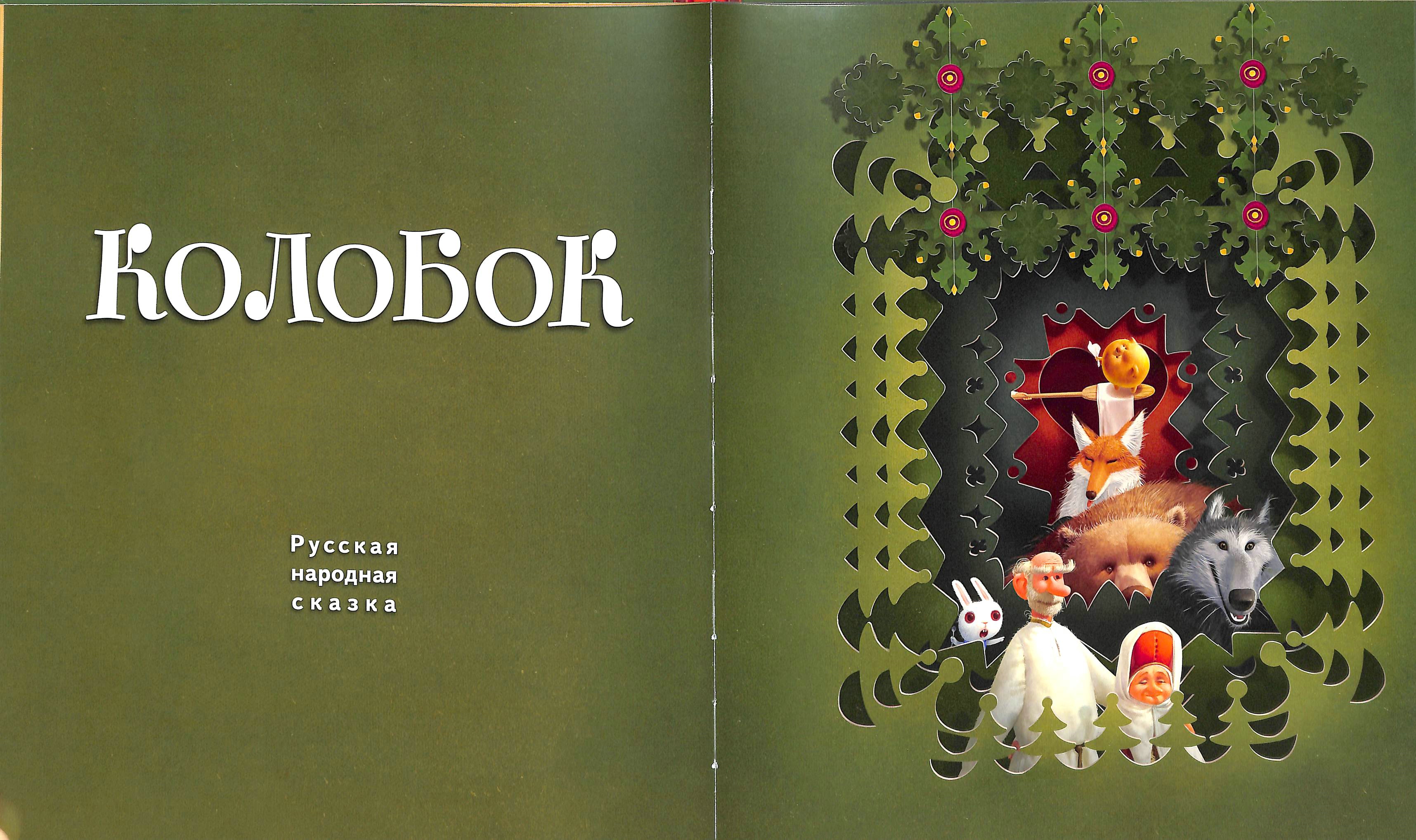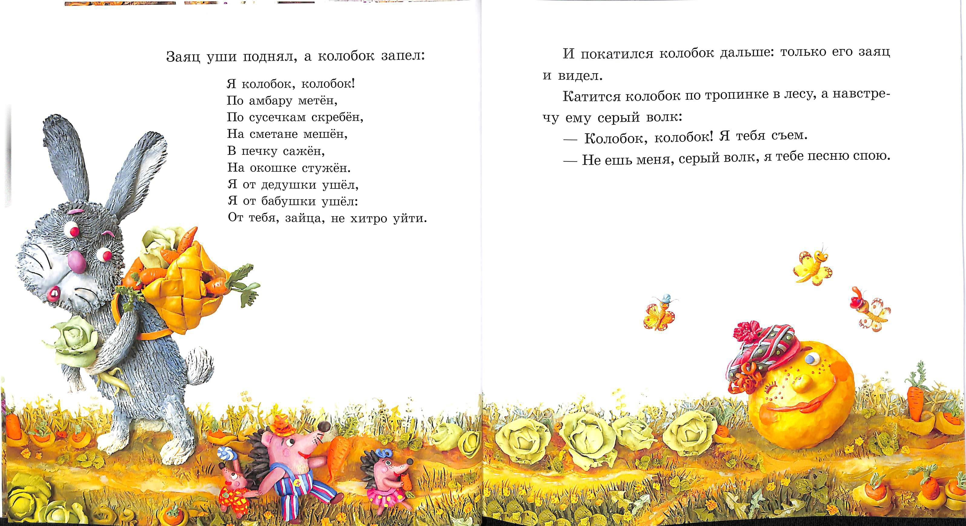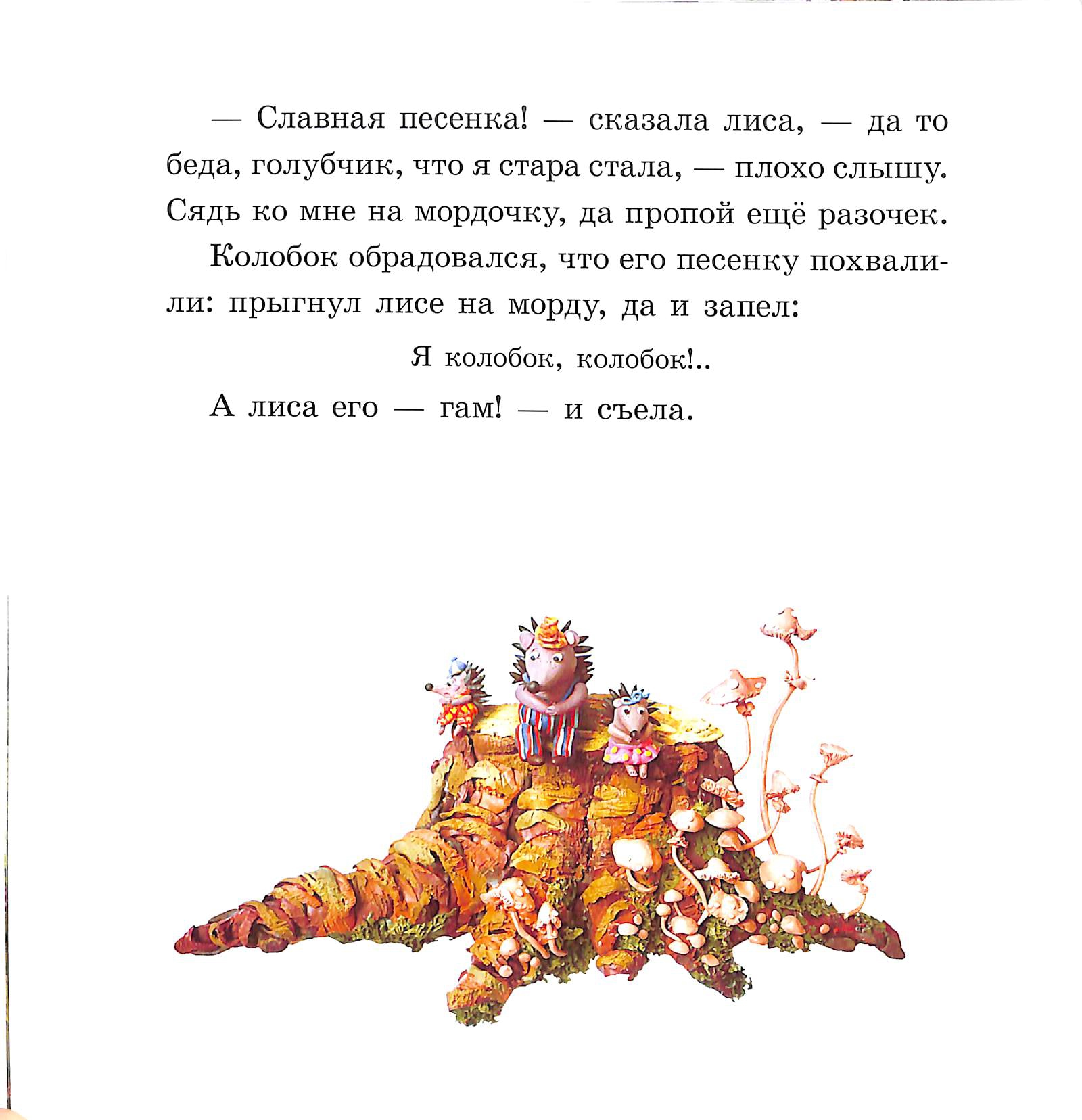 Подробно исследуется начало жизни Колобка. Фигурки деда и бабы показаны на огромном пространстве белого листа фрагментарно, причём фрагменты — все безголовые, механически обрезанные. Это единственный прокол художницы: в погоне за оригинальностью получилось просто оригинальничанье. Из собственных интересных приёмов художницы: подробная детализация второстепенных деталей и введение неканонических персонажей (пока что кот с мышами).
