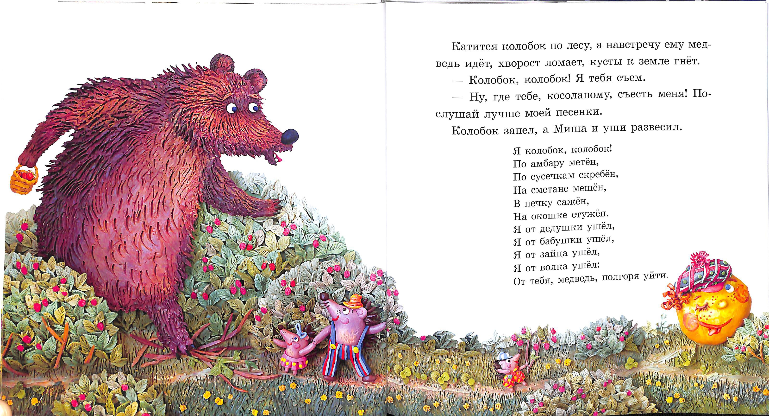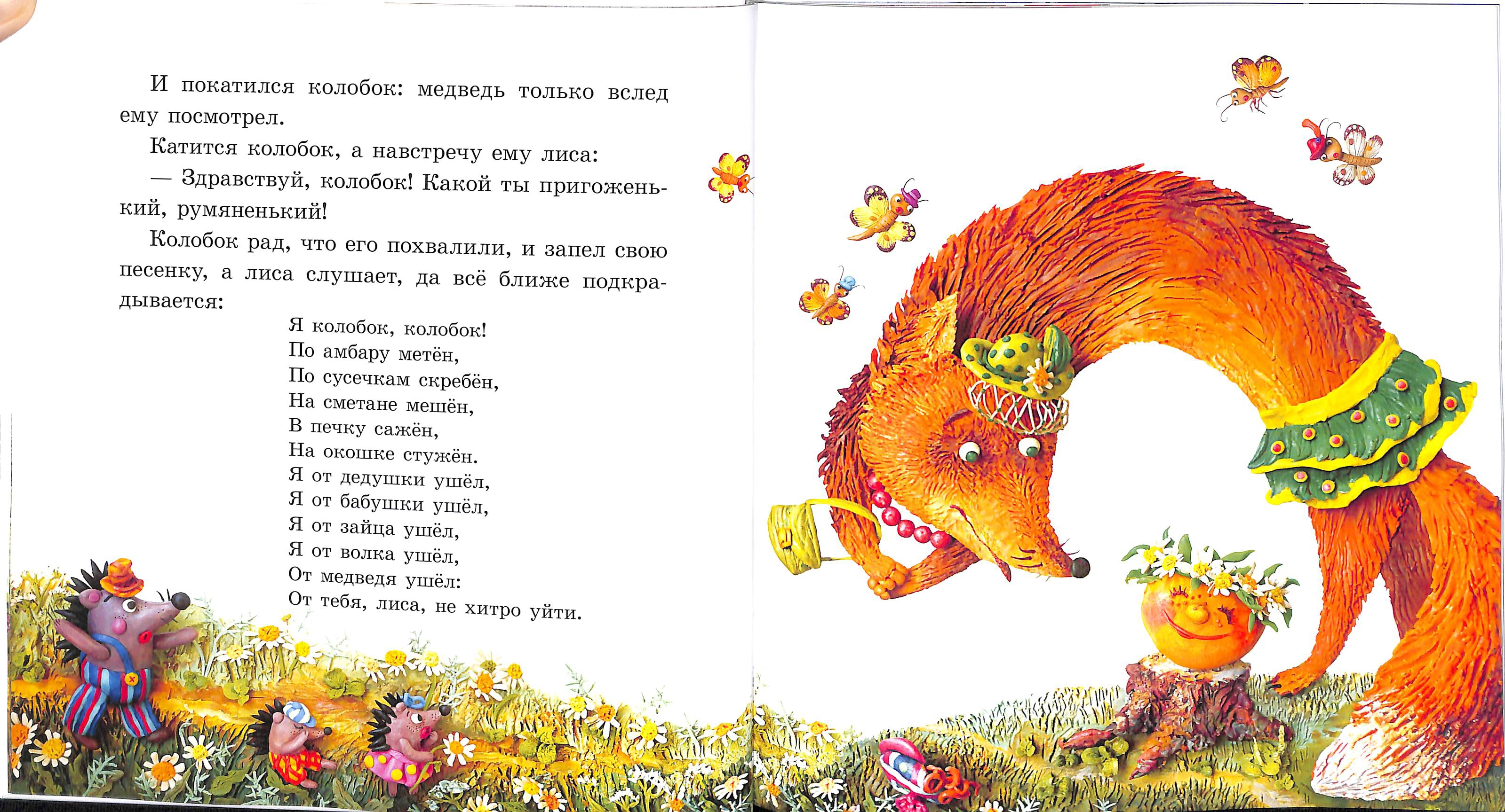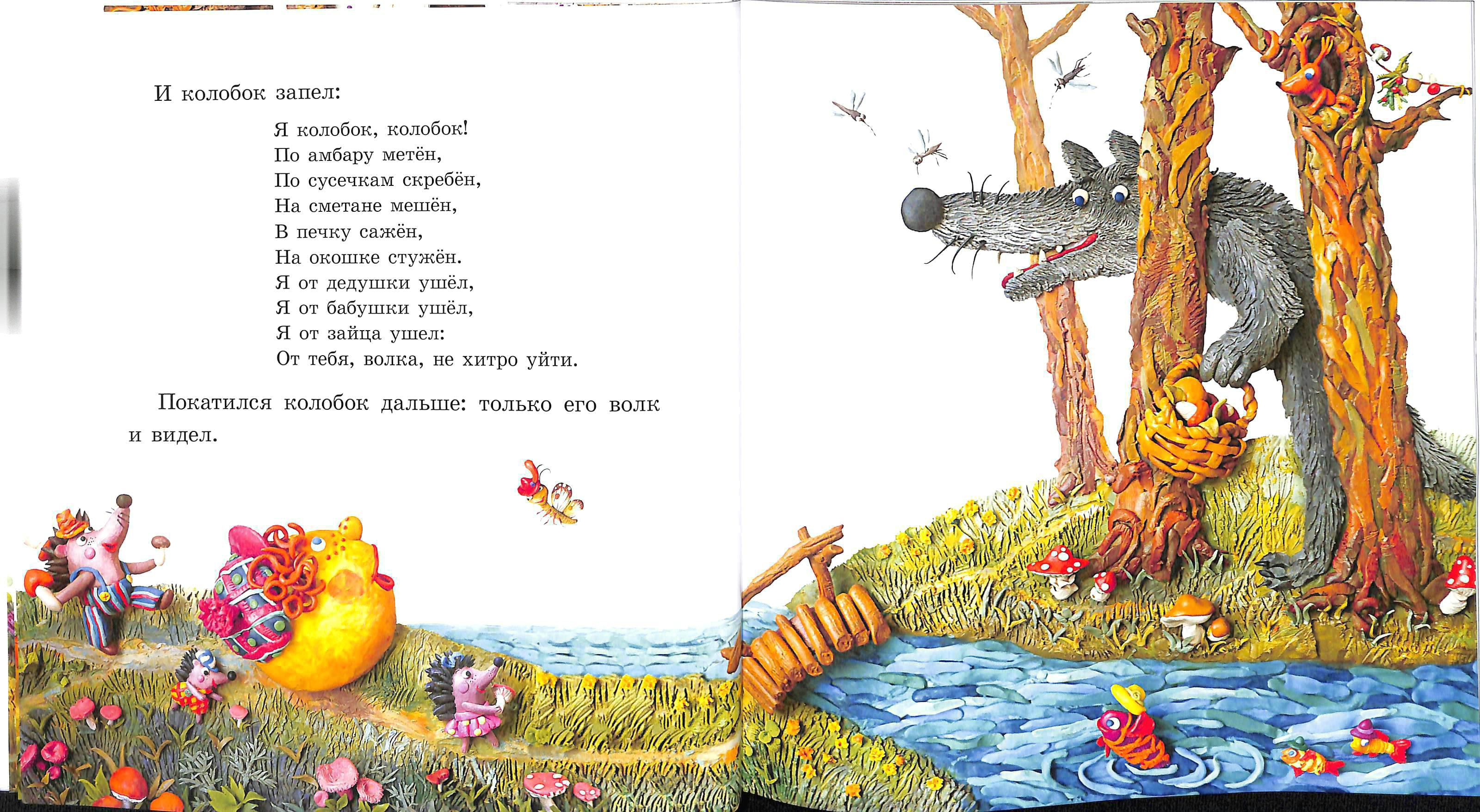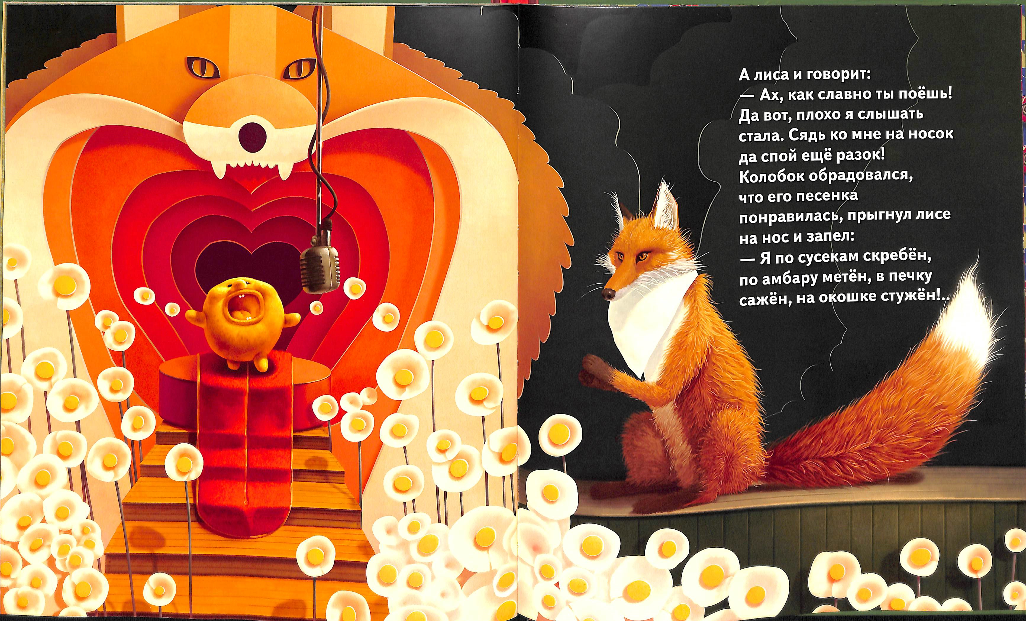 Колобок поёт на подиуме, который представляет собой лисью пасть. Художник, выросший в России, даже из нынешнего поколения, эту сцену не стал бы так рисовать: посчитал бы её затёртой. В советских журналах (не только детских) частенько обыгрывалась песенка Колобка как пародия на эстраду. Но иностранец рискнул. Хорошо получилось.