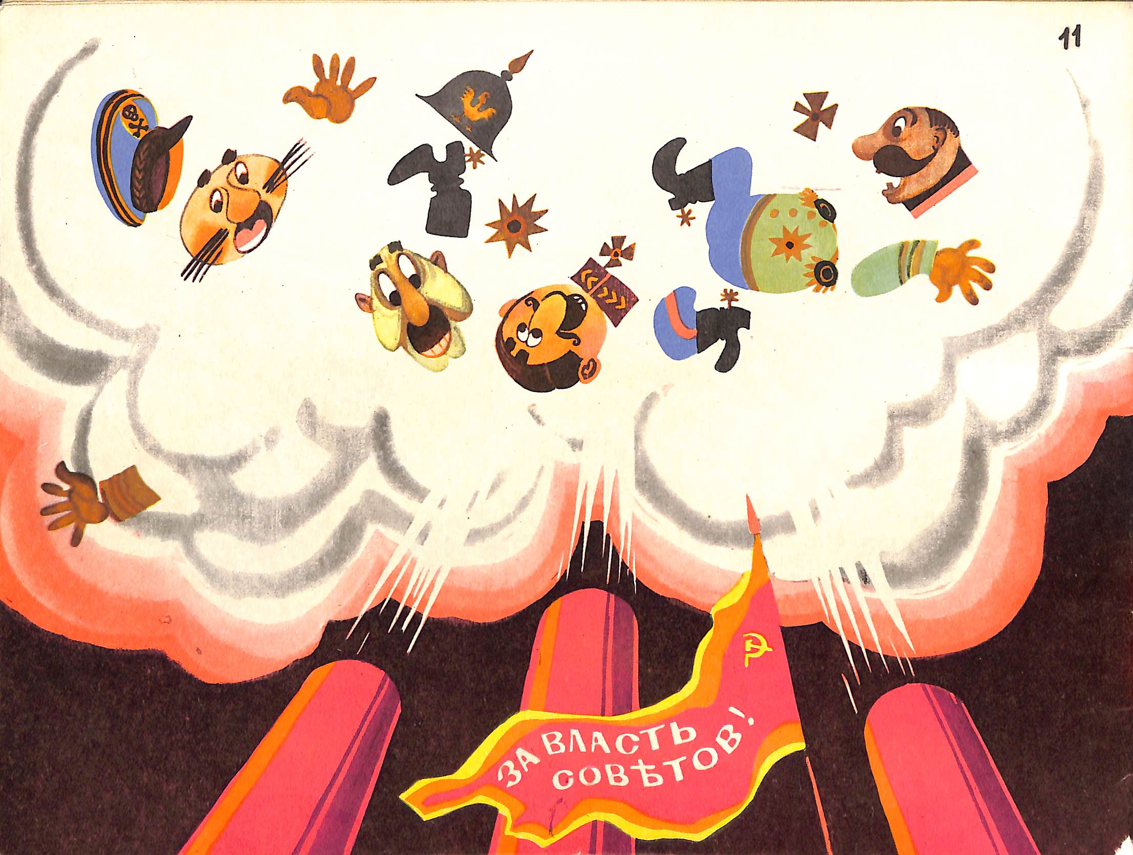 Абстрактная композиция. Традиционный для детских книжек лозунг "За власть советов" с ятями (исторически неверный).