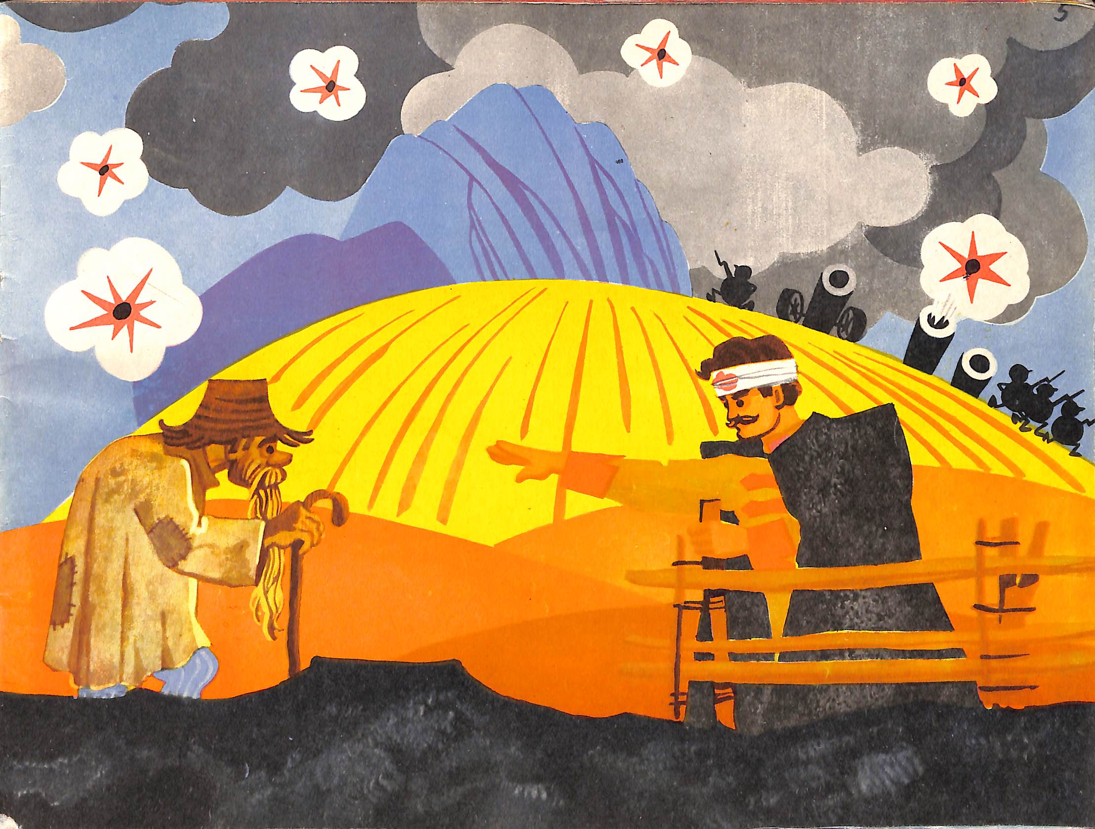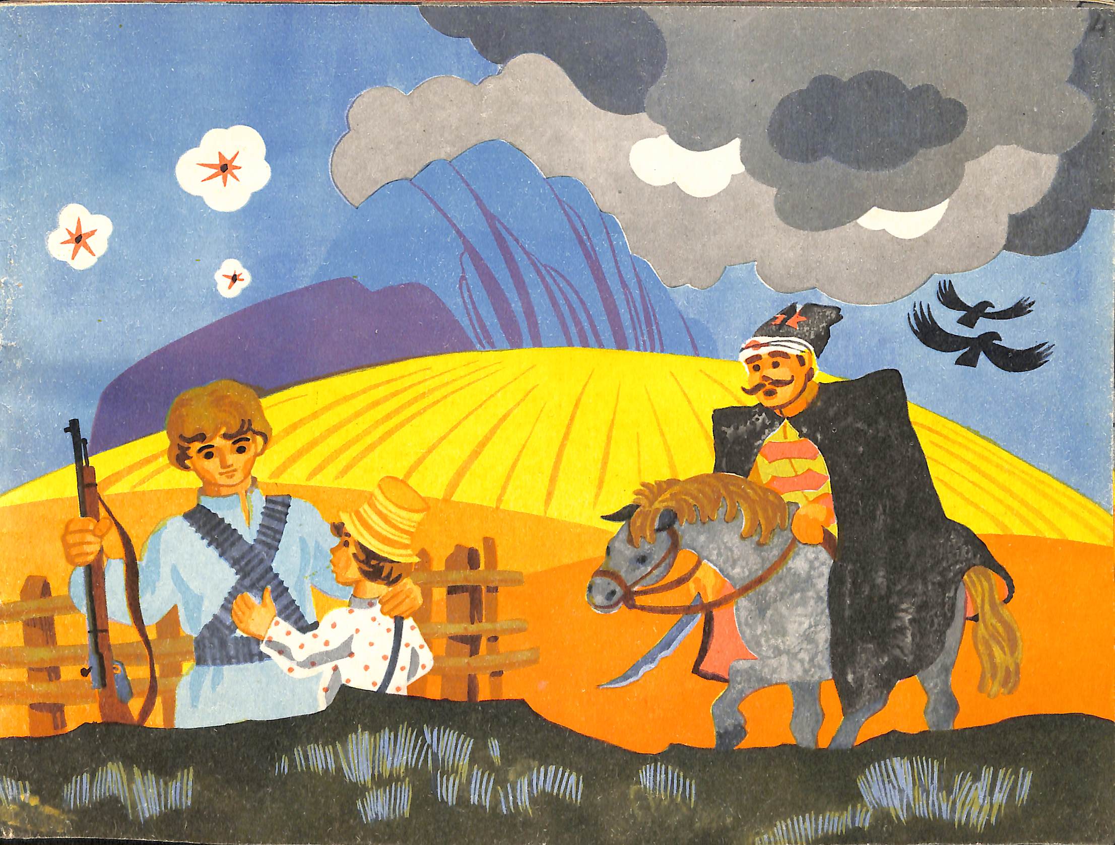 Совмещение в одной картинке вторичного появления всадника и прощания Мальчиша со старшим братом. На небе — уже и не тучи, а клубы дыма и разрывы шрапнели.