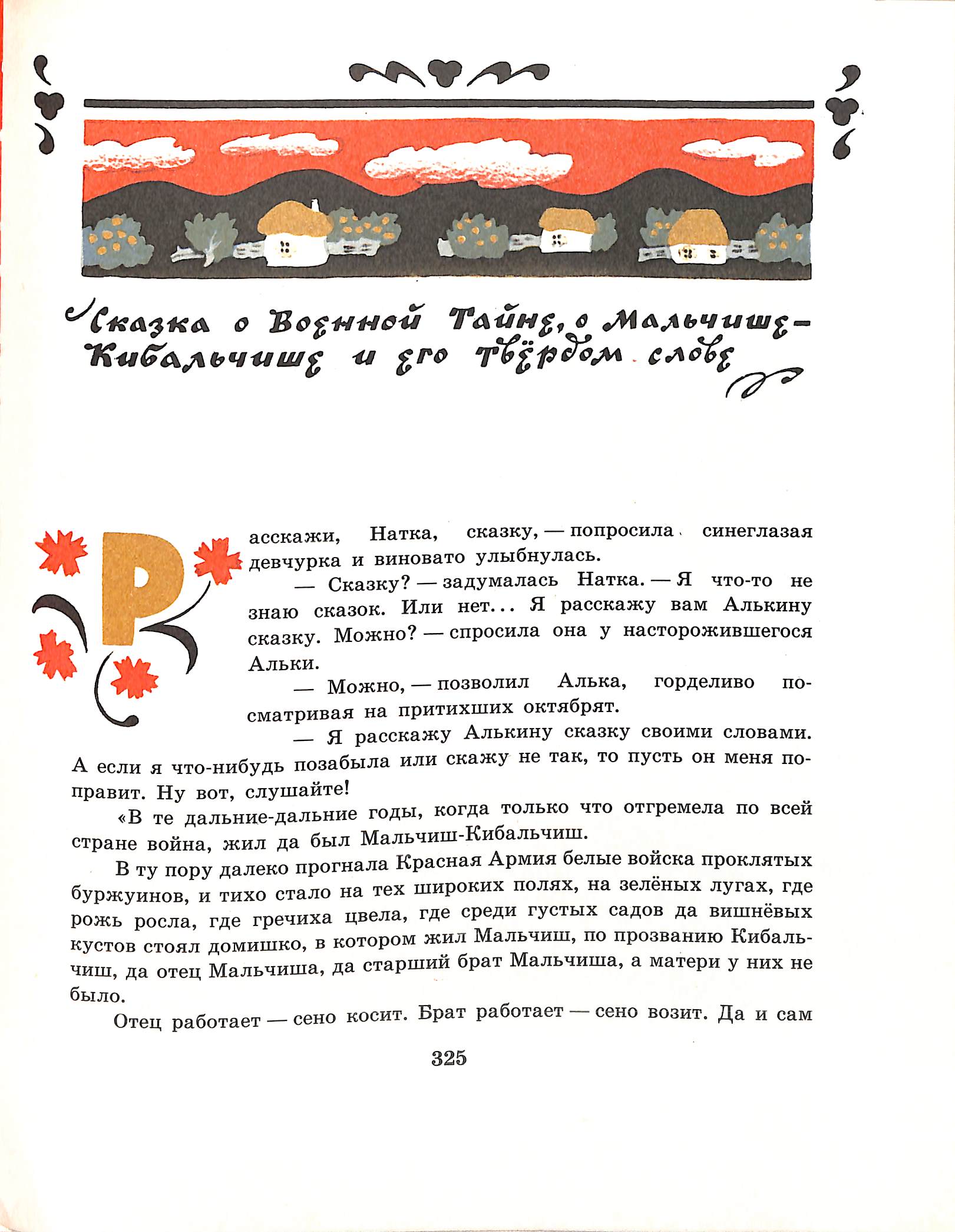 В сборнике помещена повесть "Военная тайна", а уж в ней — сказка о Мальчише-Кибальчише. Непосредственно к сказке есть две иллюстрации.