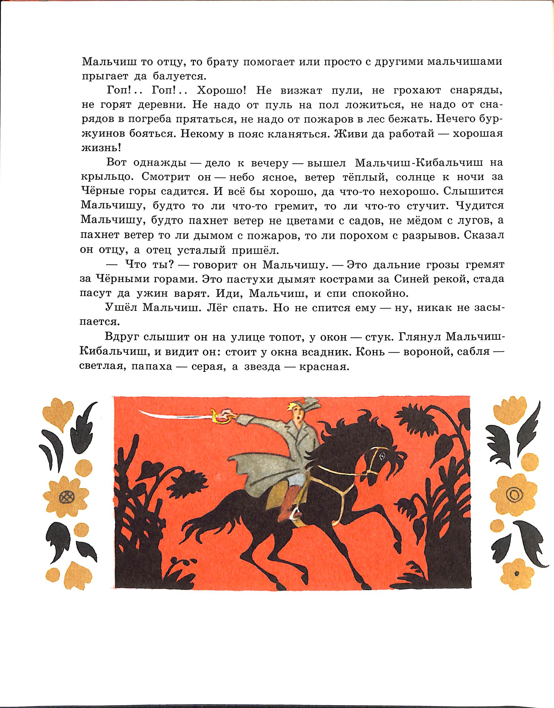 Наверное, в поздне-советскую эпоху история о Мальчише-Кибальчише превратилась в обычную обязательную для чтения детскую книжку, которая выделялась разве что неуместной страстностью. Надо издавать, надо иллюстрировать, надо читать вслух... Художники среднего уровня уже и не пытались выдать что-то незаурядное. Обычная книжка — обычные картинки.