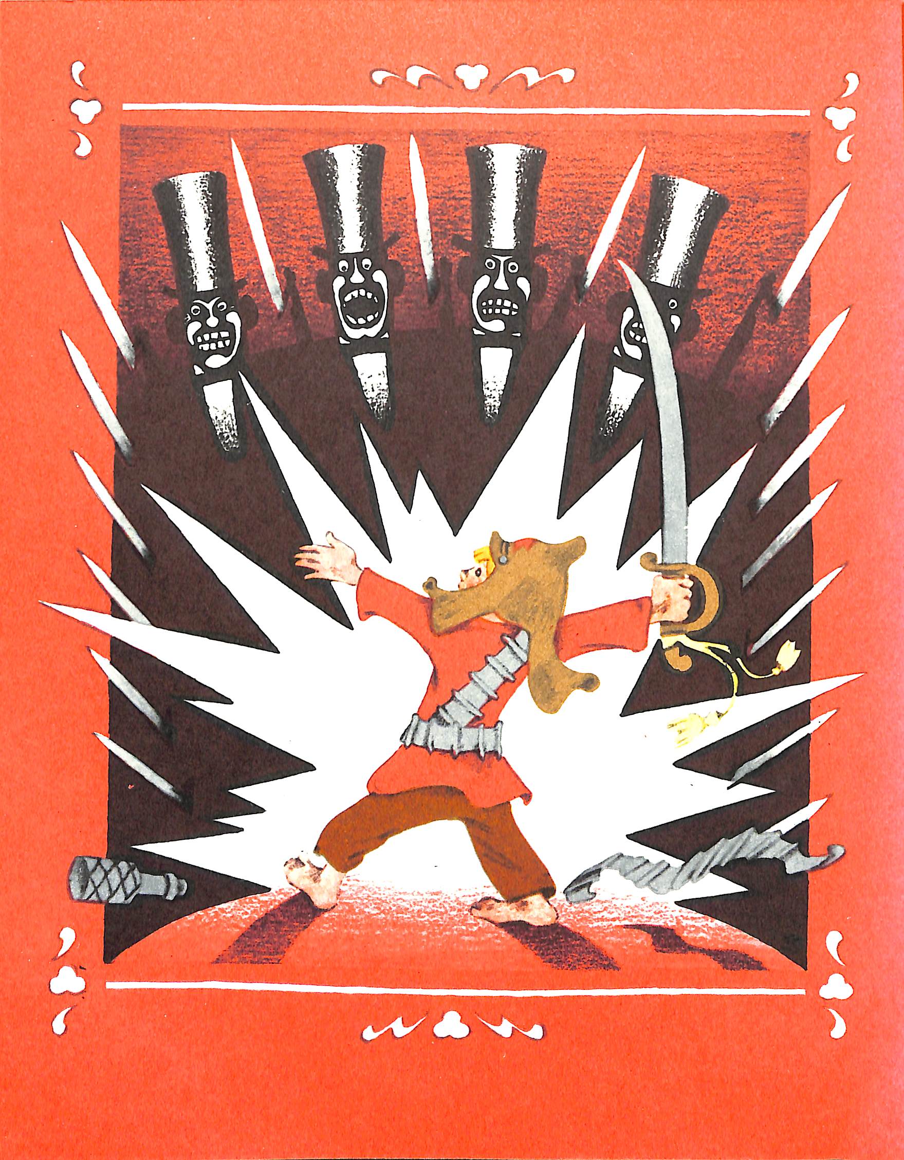 4) Одна страничная иллюстрация, посвящённая в обоих сборниках противостоянию Мальчиша и буржуинов. У Кононова буржуины — карикатурные, а у Булатова с Васильевым — инфернальные. У Кононова Мальчиш уже пленён, а у Булатова с Васильевым — символическое противостояние борющегося Мальчиша (но одинокого, уже обречённого). Сильная, между прочим, картинка. А ведь в каком-то интервью говорили Булатов и Васильев, как их воротило от советских персонажей, как они подчёркнуто шаблонно их рисовали. Но, видимо, Гайдар увлёк и таких скептиков — видно, что Мальчиша рисовали взволнованные художники.