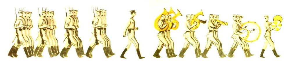 в) Солдатский походный строй (с оркестром). Солдаты в пилотках, офицер — в фуражке. Никаких будёновок. Но опять-таки при внимательном просмотре видно, что за спиной не автоматы, а винтовки.