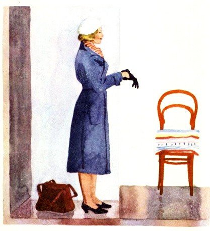 в) Женщина идёт на работу (на дежурство). Одежда не ней может быть как Тридцатых, так и Шестидесятых годов — потому что стильная. Но закрадывается сомнение: если это конец Шестидесятых, то такая модная женщина не может быть окружена старинной обстановкой. Но это косвенная догадка.
