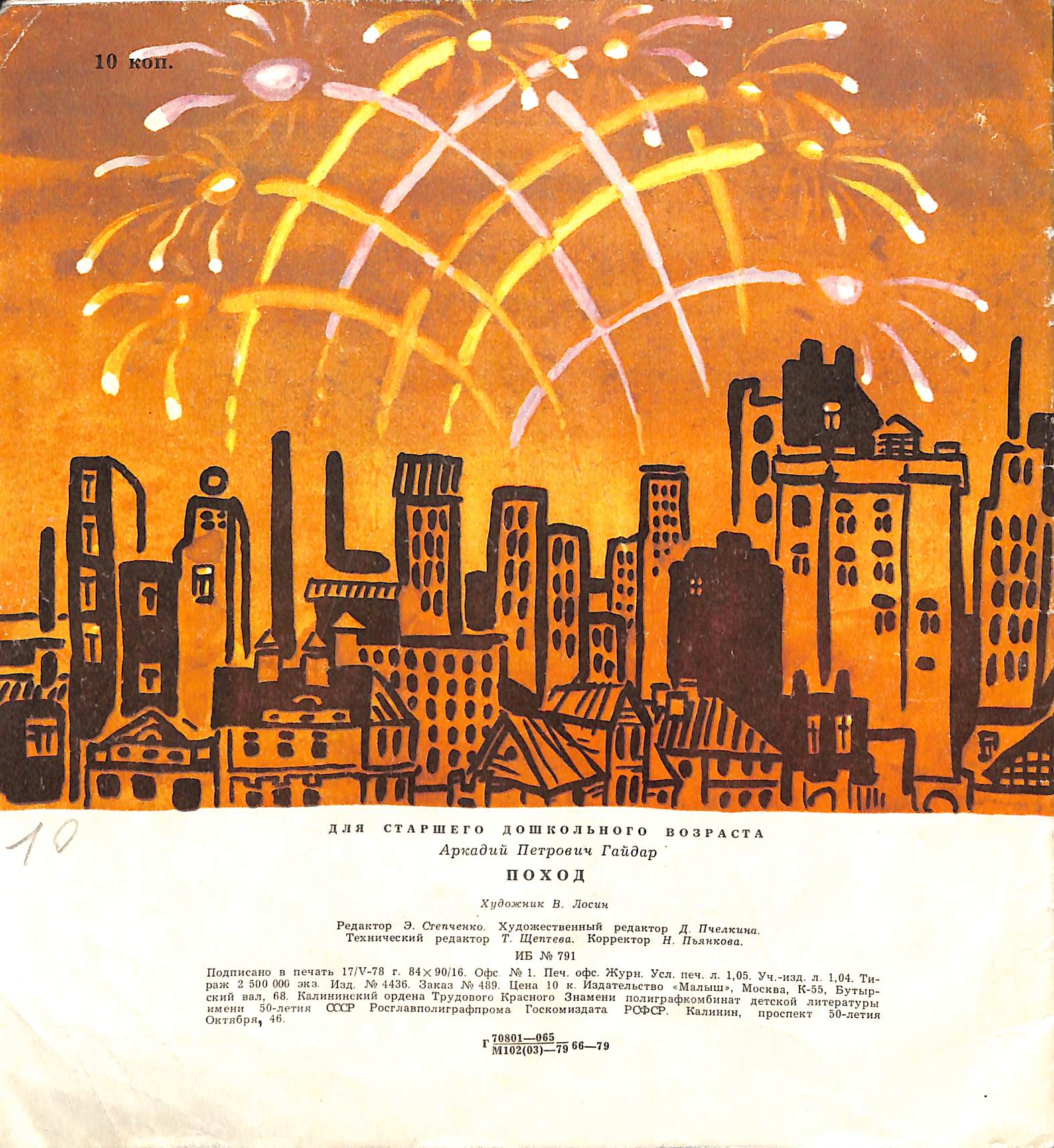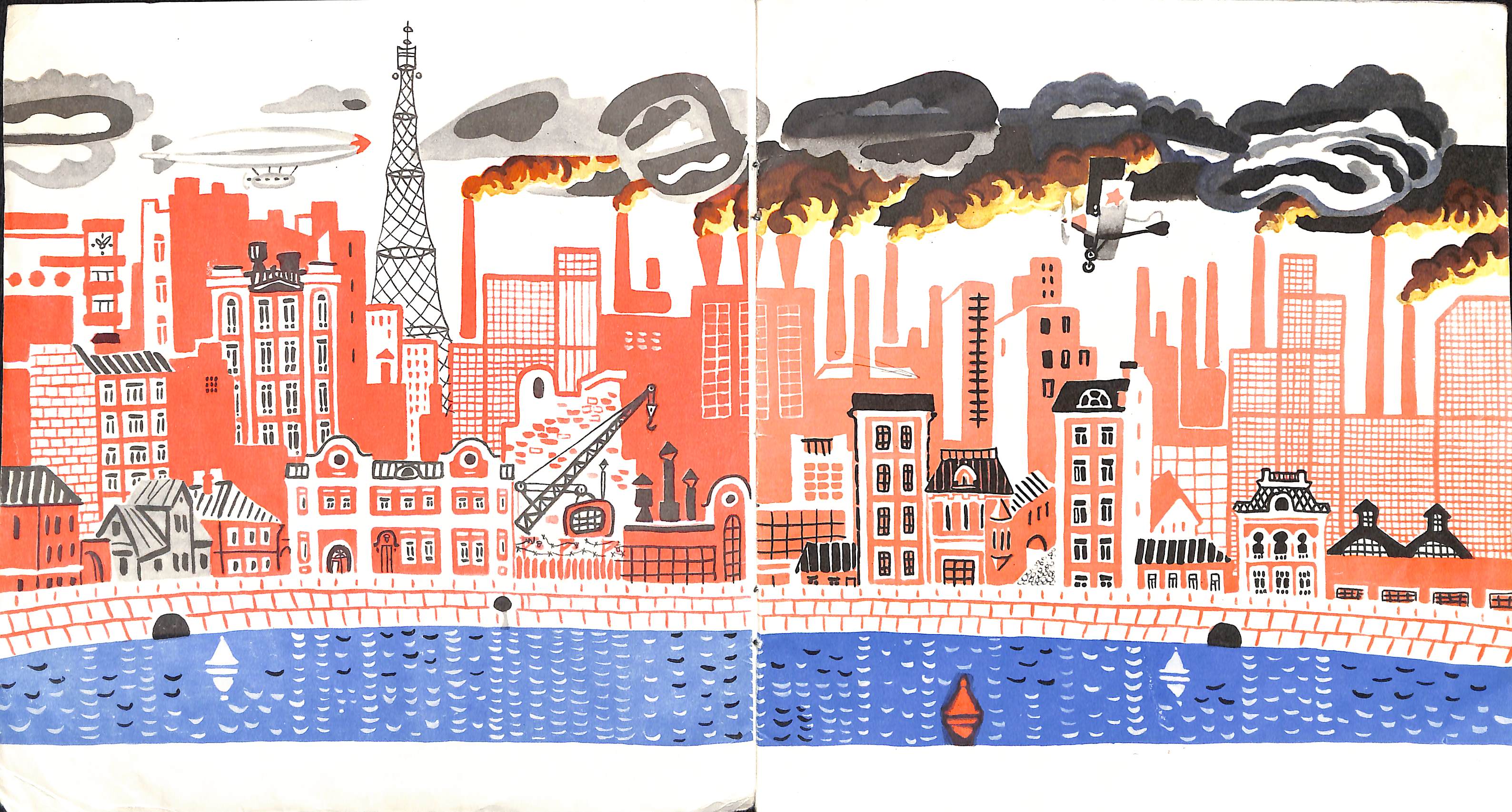 Рассказ — микро. Книжка тонюсенькая, 8 страничек. Но обложка мягкая, и если считать с ней, то будет уже 12 страниц. Первый разворот: квази-форзац. Шуховская радиобашня указывает на место (Москва), а дирижабль и истребитель-биплан в воздухе — на время (1930-е гг.). И на заставке тоже — радиобашня с серийным аэропланом и ещё церквушка. Общим фоном — дымят заводы. Символ стремительных перемен — не только в противопоставлении церквушки и радиобашни, но и в соседстве самой радиобашни (1920 год, голый революционный энтузиазм) с поликарповским истребителем (плоды индустриализации).