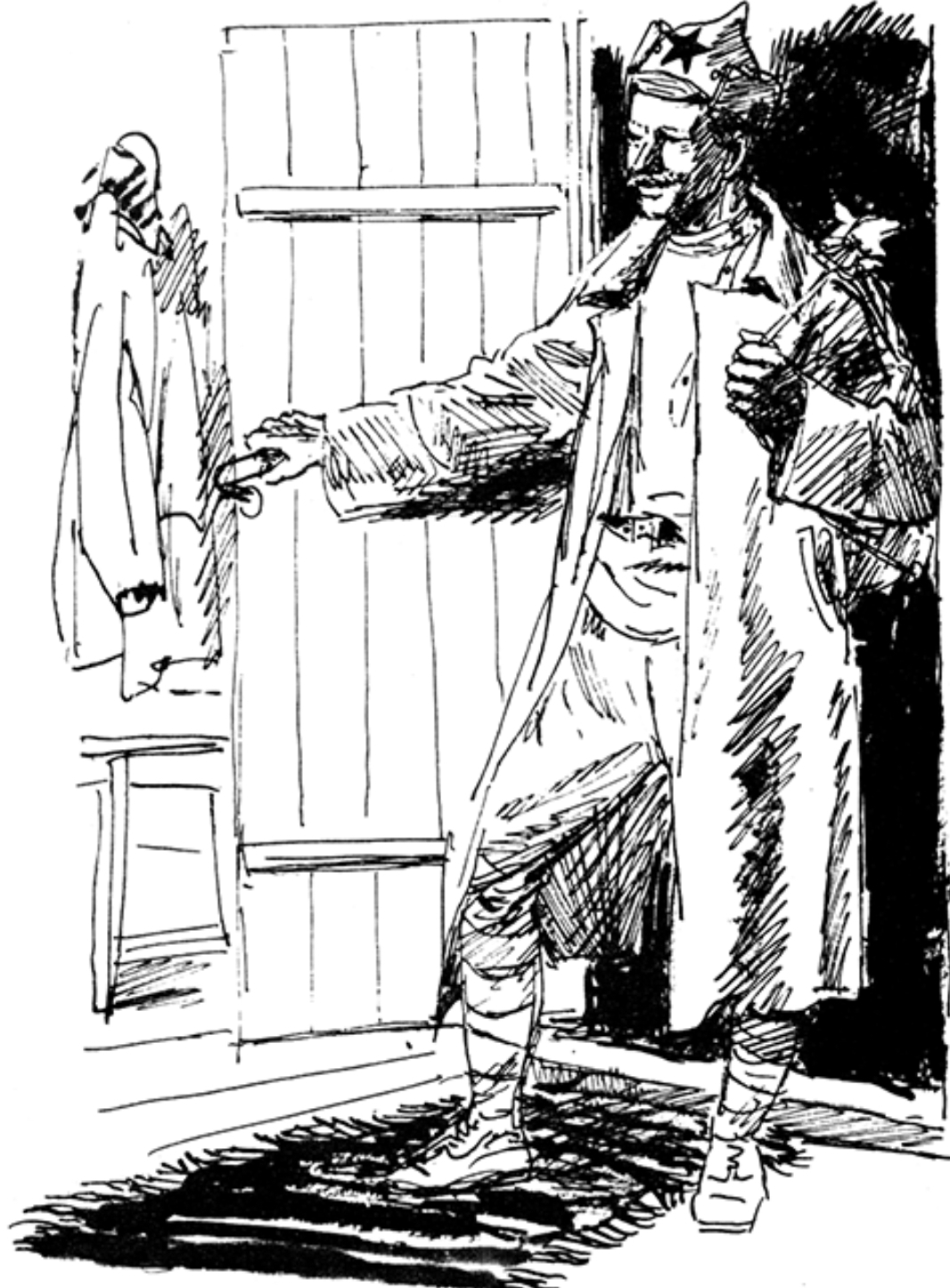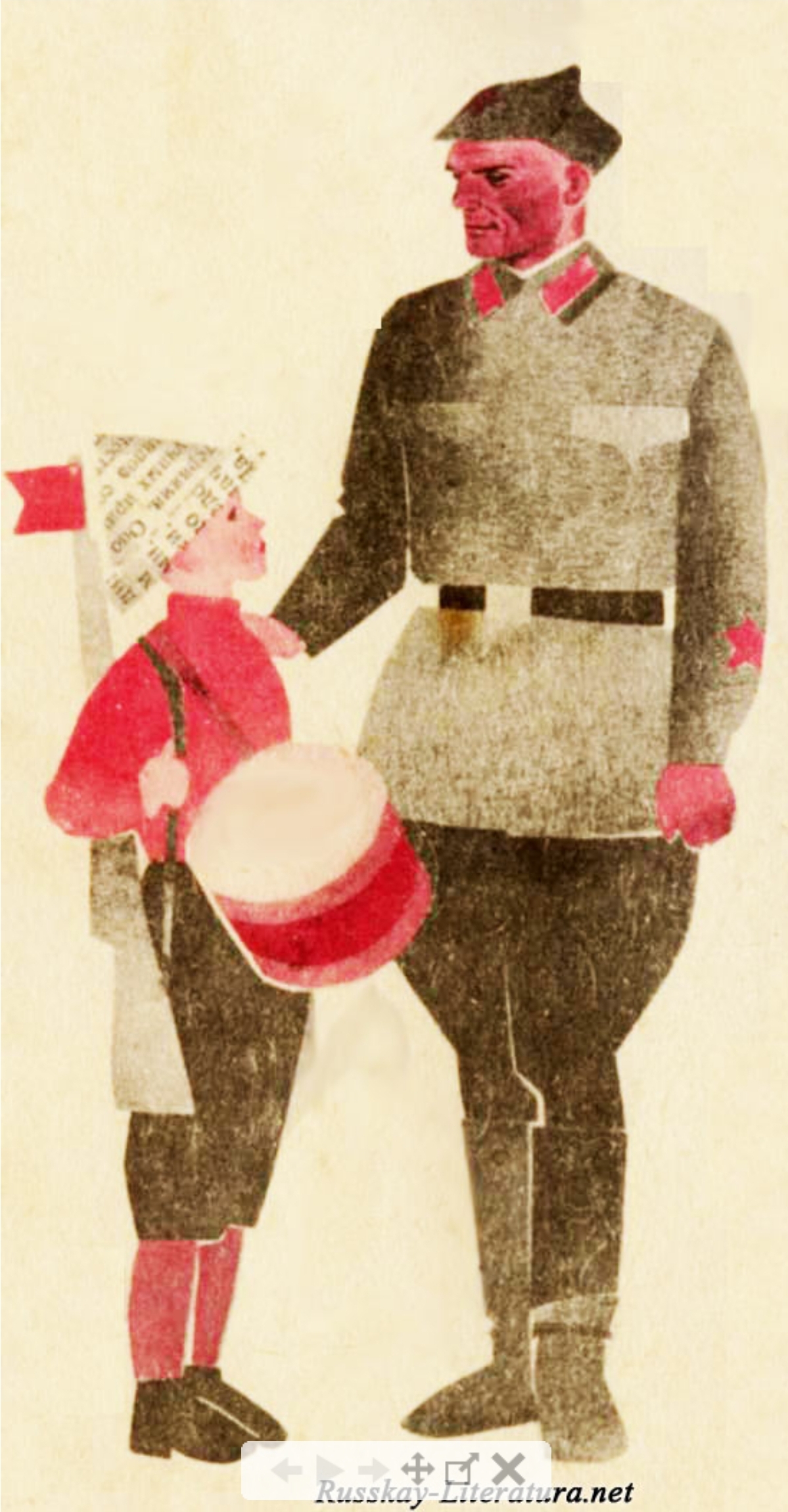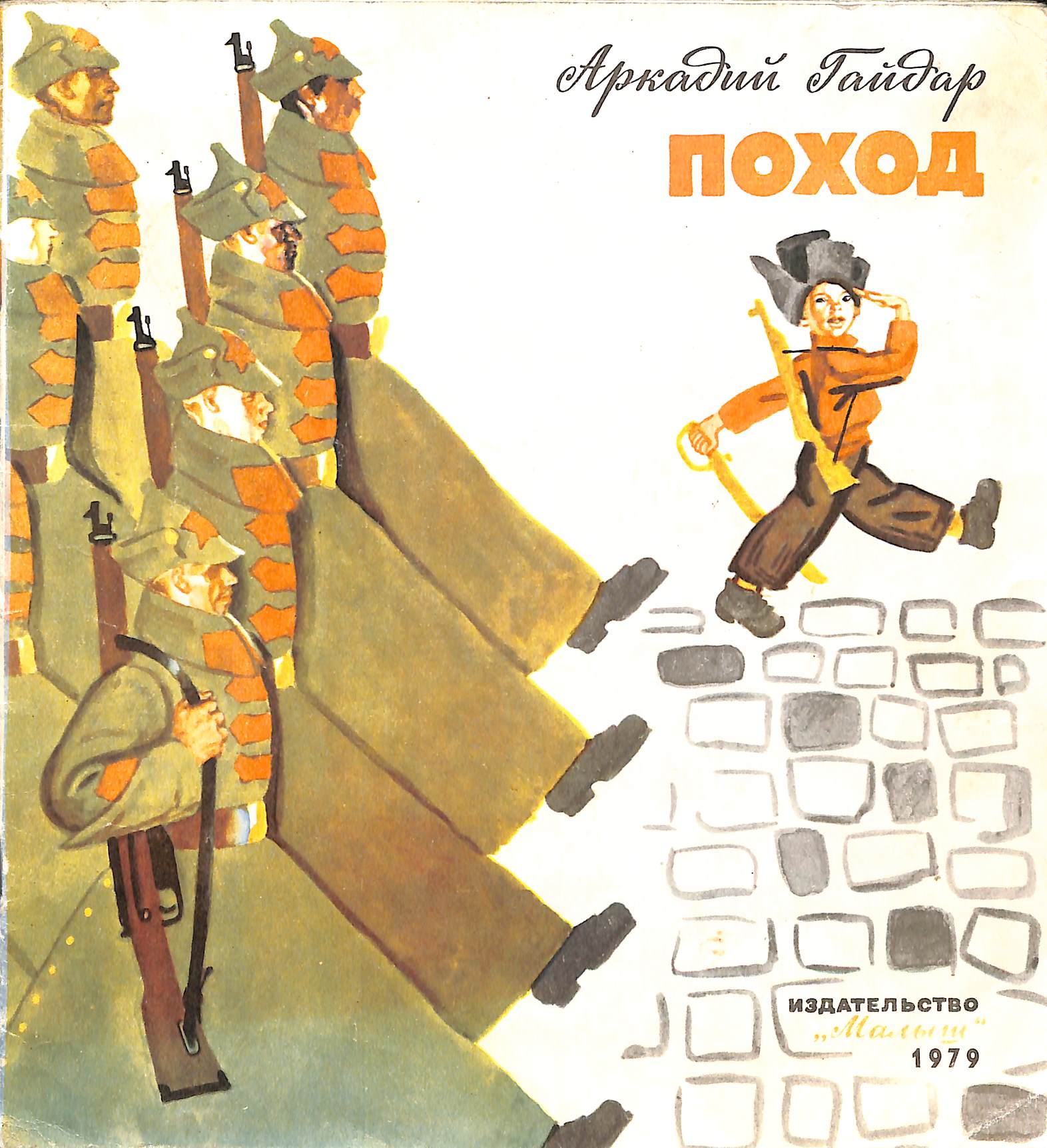 а) Начать можно с обложки. Мальчик в будёновке и с саблей маркером времени быть не может — это нормальные детские игры конца 1960-х — начала 1970-х гг.. Как раз был последний всплеск интереса кинематографа к теме Гражданской войны. Взрослый — вроде бы в военной форме брежневской эпохи: шинель без украшений, фуражка, никакой шашки не видно. Поза такая, что нельзя разобрать, есть на плечах погоны или нет. Только внимательно присмотревшись, можно понять, что большие квадратные петлицы на шинели указывают на довоенное время.