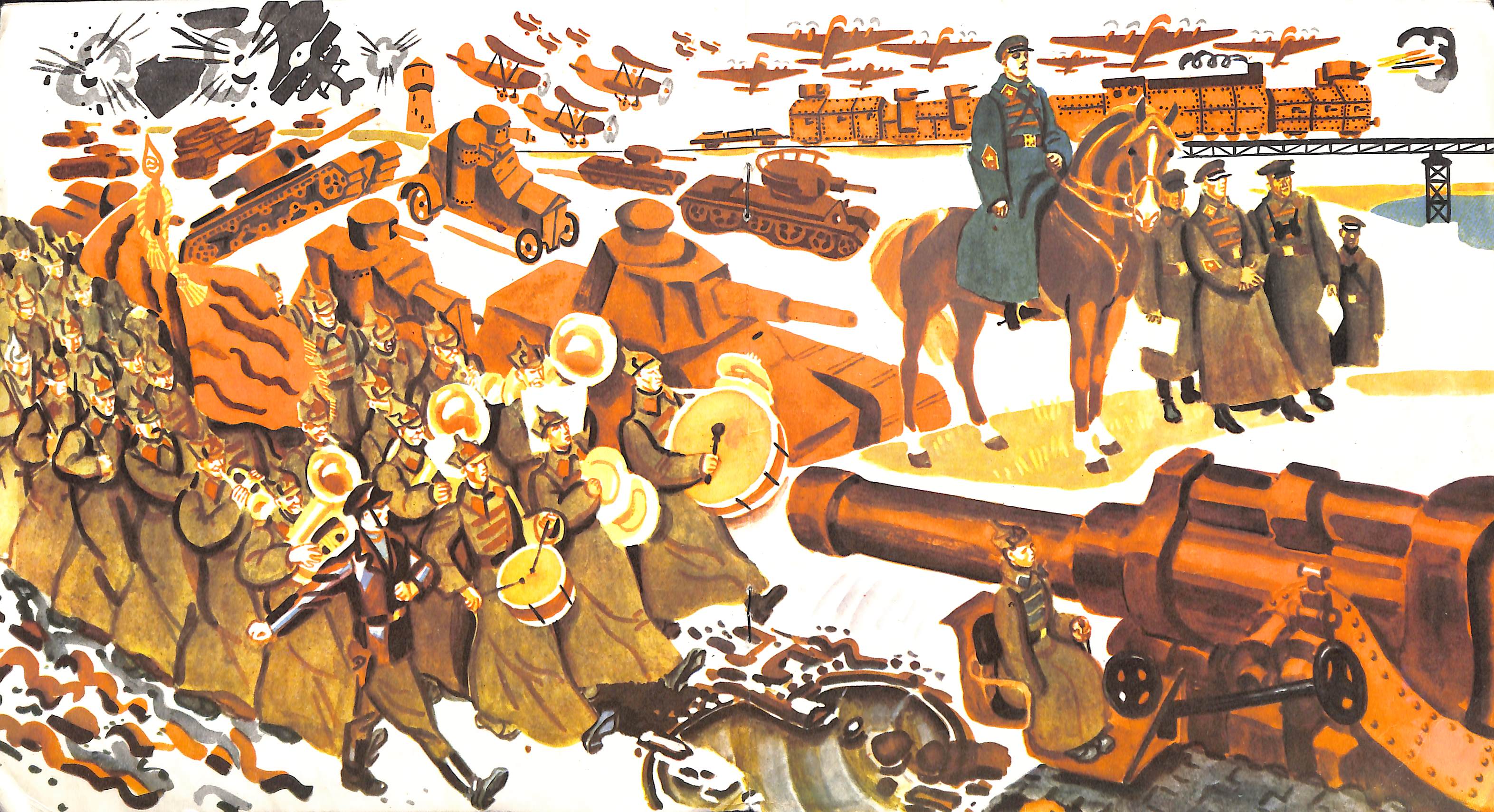 Лосин принимает правила игры: у него чуть-чуть подправленная историческая реальность. А получается крутая фантастика. Красноармейцы — в шутовской форме 1920-х гг. (красные клапаны на шинелях), комиссар в кожанке — вообще из 1918-го года. Но Ворошилов на коне уже с маршальскими звёздами в петлицах (т.е. не ранее 1935 года). Броневик с бронепоездом из эпохи Гражданской войны, разномастные танки, но угадываются БТ и даже Т-34 — из позднейшей эпохи. А гаубица образца 1931 года на гусеничном ходу! БТ сгинут в 1941 году, но эта гаубица ещё и по Берлину постреляет в 1945-м.