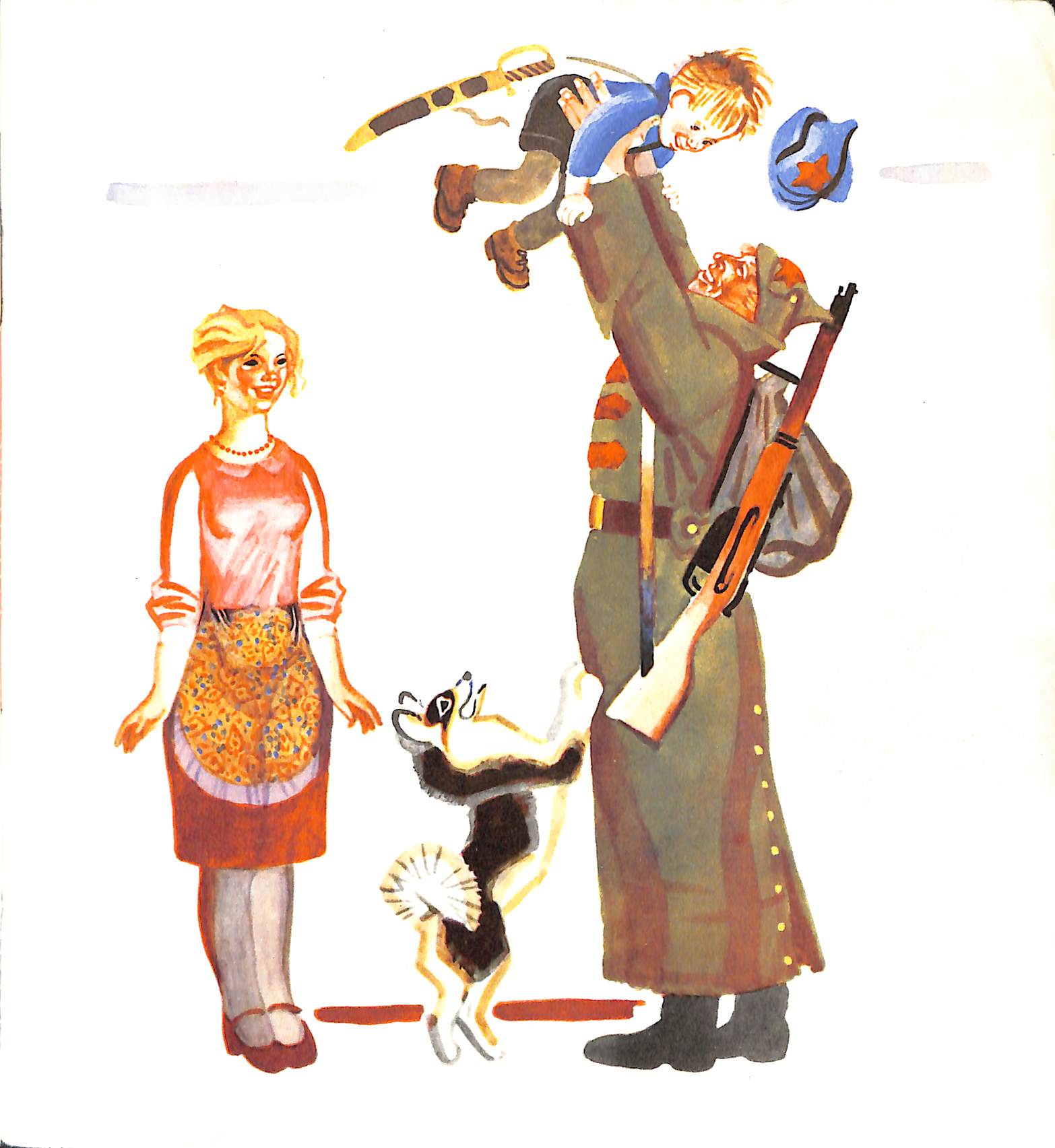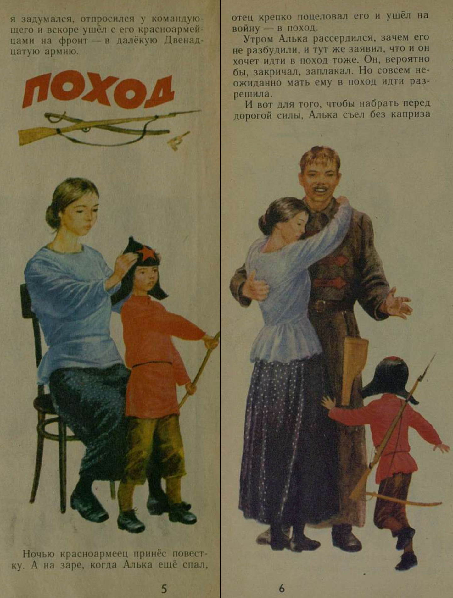 Ночью красноармеец принёс повестку. А на заре, когда Алька ещё спал, отец крепко поцеловал его и ушёл на войну — в поход.