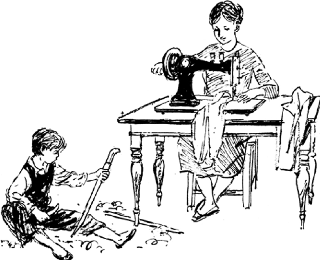б) Женщина за швейной машинкой с ножным приводом. Я такую у бабушки в начале Семидесятых обожал крутить за большое колесо.