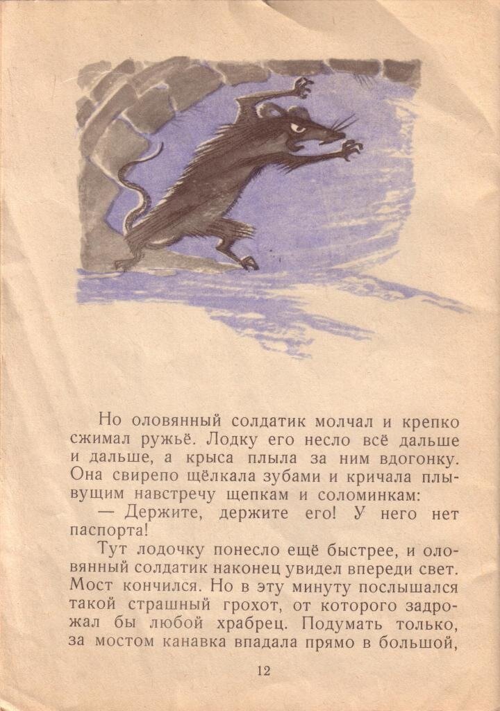 И присутствует важная деталь. Крыса действительно говорит: "Паспорт есть? Давай паспорт!". Но затем, когда солдатик молча проплывает мимо, преследует его, крича: "Он не уплатил пошлину!" (про отсутствие паспорта тоже кричит). Так, значит, крыса — мелкий таможенный чиновник! Таможня — орган серьёзный, но все же не карательный. Поэтому и крыса — растолстевшая и в очках. Только такая крыса — настоящая андерсоновская крыса.