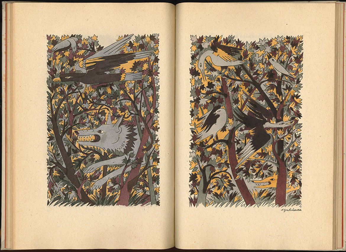 Все помнят, как Боян растекался мыслию по "древу". Но сначала он волком и орлом был. Гончарова эти образы с удовольствием рисует в духе средневековых виньеток.