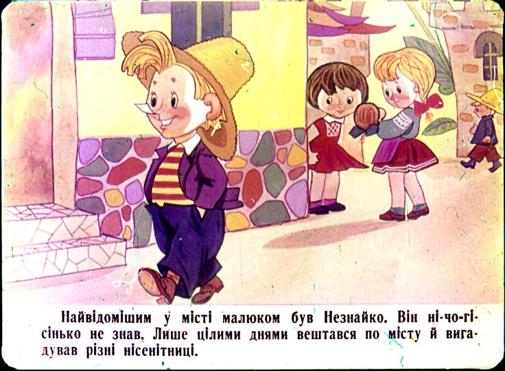 Этот Незнайка носил яркую голубую шляпу, желтые, канареечные, брюки и оранжевую рубашку с зеленым галстуком. Он вообще любил яркие краски. Нарядившись таким попугаем, Незнайка по целым дням слонялся по городу,