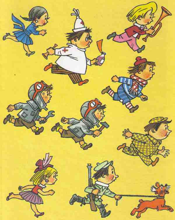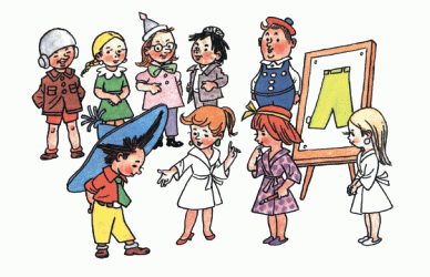 Поскольку это были иллюстрации к школьной пьесе, Вальк нарисовал подростков в театральных костюмах. Шляпа на Незнайке есть, но это обычный школьник, равно как и дебелые старшеклассницы, играющие малышек-медработниц.