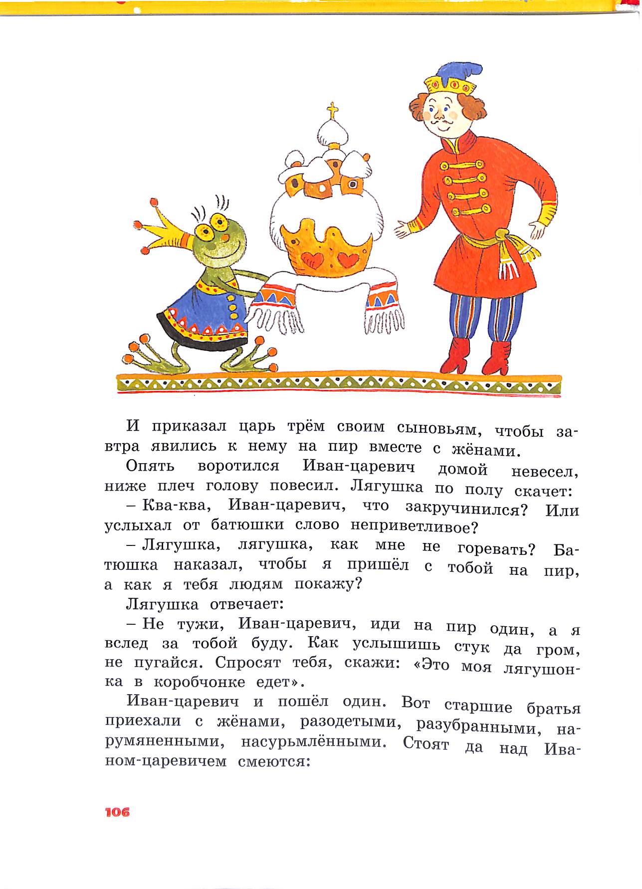 7) Опять новый приём: непрерывная иллюстрация внизу — это путь Ивана-царевича. Здесь все звери в последовательности их встречи (кроме щуки — у неё особая роль). На полях левой стороны — старичок с клубочком, это начало пути. На полях правой стороны — избушка на курьих ножках, это конец пути. Читаем слева направо и по кругу, против часовой стрелки. В книге на арабском языке такие картинки не сделаешь.